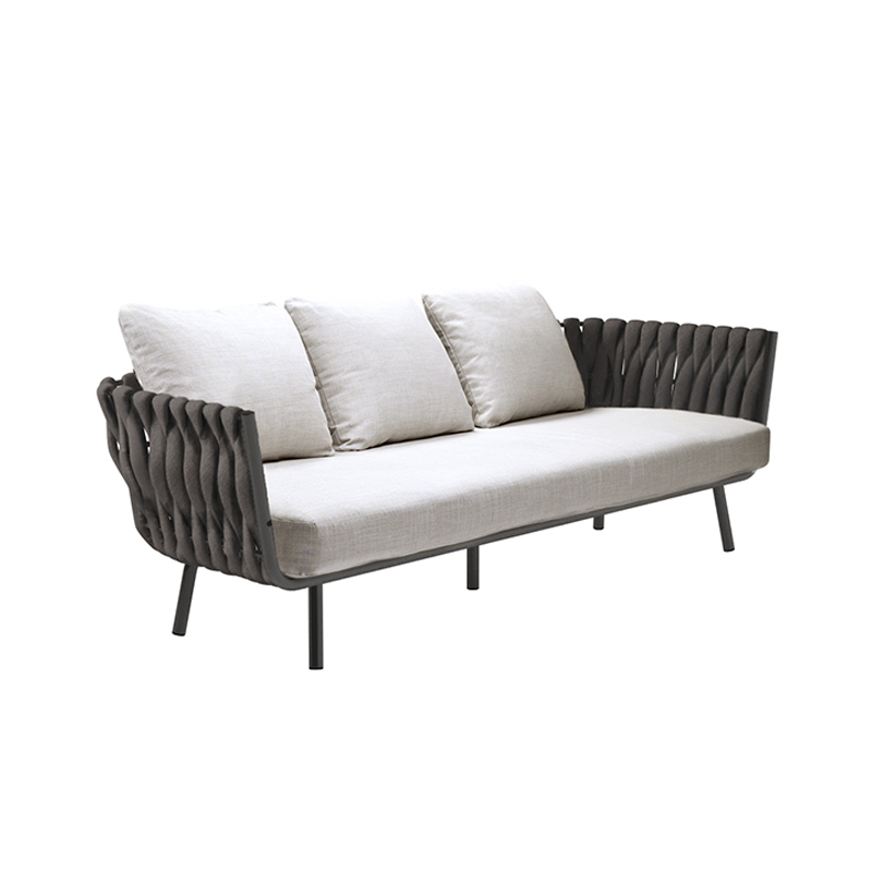 La collection de meubles d'extérieur Tosca de la marque Tribu est à la fois accueillante et chaleureuse, chic et intrigante. C'est la première fois que Tribu fait appel à Monica Armani, qui a conçu cette luxueuse collection chargée d’émotion et de féminité, combinant des assises au tressage vertical extra large soutenues par des pieds effilés légèrement convergents. Les matériaux utilisés pour la création du canapé Tosca 3 places le tressage du dossier est sans aucun doute innovant : une mousse  recouverte d'une gaine tricotée non seulement résistante aux intempéries, mais qui est aussi extrêmement douce au toucher avec un aspect totalement naturel. Le canapé Tosca 3 places, avec ses formes ultra-généreuses, est le cadre idéal pour lézarder et rêver au soleil. Le confort d'assise est très moelleux, grâce aux confortables coussins avec un rembourrage spécifiquement conçu pour l'extérieur.