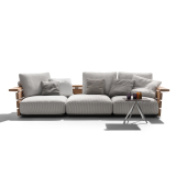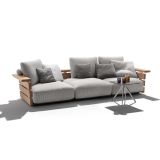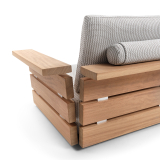 Ontario s'expriment pleinement grâce à l'utilisation d'un matériau de haute qualité tel que l'iroko massif, choisi pour créer l’imposante structure. La matérialité chaleureuse du bois caractérise fortement la structure du canapé entièrement constituée de lattes d'iroko de forte épaisseur et d'entretoises en métal moulé sous pression peint à la poudre. La rigueur formelle de la structure en bois est adoucie par les coussins d'assise et de dossier généreusement rembourrés. Les coussins de dossier sont dotés d'un rouleau caractéristique – devenu, au fil du temps, l'un des éléments distinctifs de la société – qui repose sur la structure en iroko et apporte un soutien particulièrement confortable. Un cadre périmétrique en acier, placé en retrait, maintient le canapé décollé du sol et le préserve de l'humidité. Disponible en deux profondeurs, le système de sièges