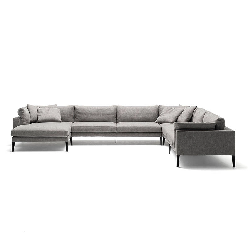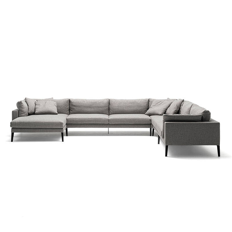 La famille Floyd-Hi 2 devient modulaire : des formes fluides et rassurantes qui se développent dans l'espace pour créer la composition souhaitée. Cette collection permet de créer des compositions d'une grande sobriété associée à une assise accueillante et confortable. La structure du dossier du canapé Floyd Hi 2 System est en bois de peuplier multicouche et en bois de sapin à double paroi, rembourré en mousse de polyuréthane à densité différenciée, et recouvert de fibre de polyester non tissée, résinée et aiguilletée, collée sur un support en velours polyamide. Le châssis du siège est en acier, avec revêtement en poudre époxy, suspendu par des sangles élastiques en caoutchouc revêtues, rembourré de mousse de polyuréthane. Les coussins de dossier et d'accoudoir sont en duvet d'oie prélavé et stérilisé, cousu dans des compartiments séparés, avec insert en mousse de polyuréthane. Les coussins d'assise moelleux sont réalisés en mousse de polyuréthane à densité différenciée et insert Visco-soft, recouvert de couches de fibres acryliques. Les pied sont en tôle d'acier découpée au laser avec revêtement en poudre époxy de couleur gris métal. Support de sol fixé par des pieds en PVC noir. Le revêtement est disponible en tissu ou en cuir, tous deux entièrement amovibles par des fermetures à glissière et des velcros.