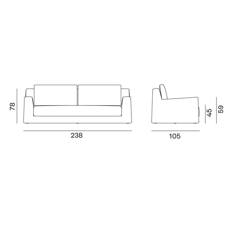 l 238 x p 105 x h 78 cm, assise h 45 cm