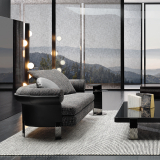 Pensés comme de parfaits éléments pour conférer élan et légèreté au produit, les pieds saillants en acier se caractérisent par une finition Black-Nickel. La même finition est prévue pour la base pivotante du fauteuil lounge.