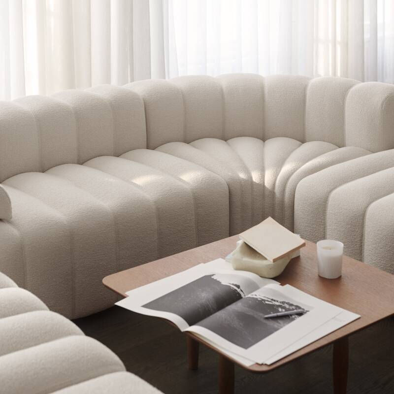 Le coussin d'accoudoir est indépendant et peut être déplacé et repositionné à travers la série, équilibrant le rembourrage cannelé.