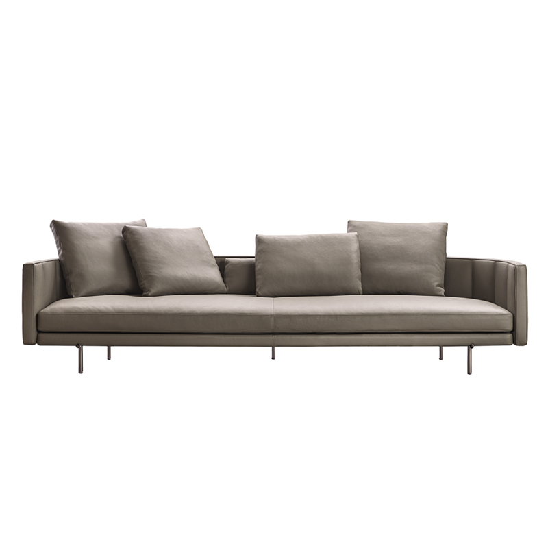 Cet éventail structuré de produits permet de donner naissance à des configurations flexibles où l’on peut notamment assortir les éléments individuels pour créer une forte unité visuelle. Le dossier, peu épais, est traversé par un capitonnage à bandes verticales ainsi que par un passepoil sur le pourtour du rembourrage, des éléments qui soulignent l’esprit haute couture de