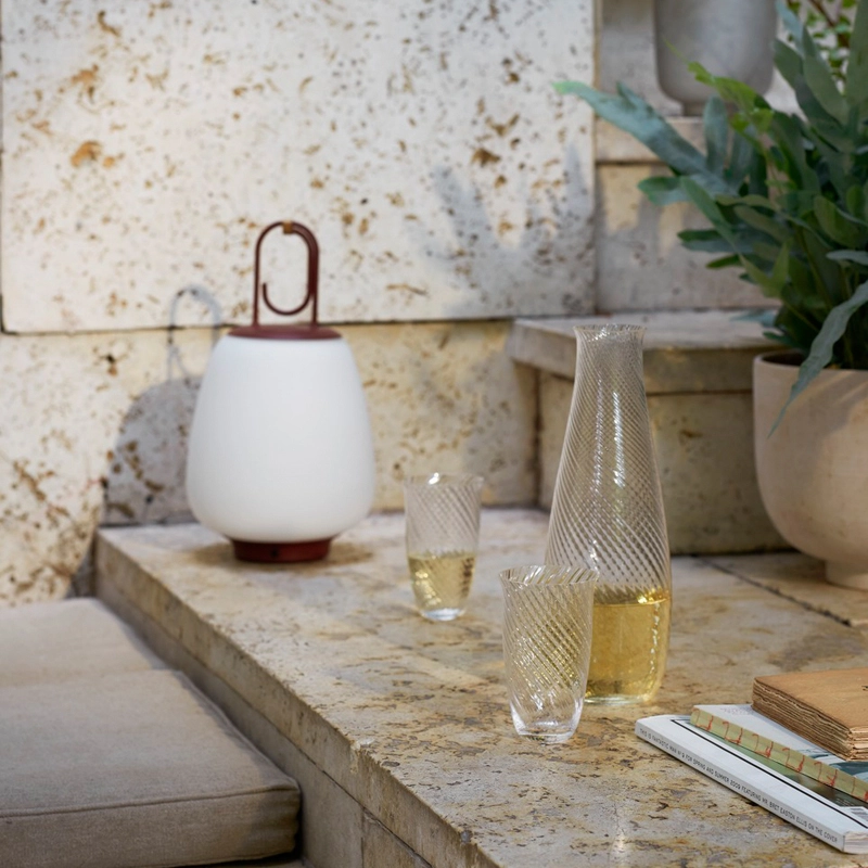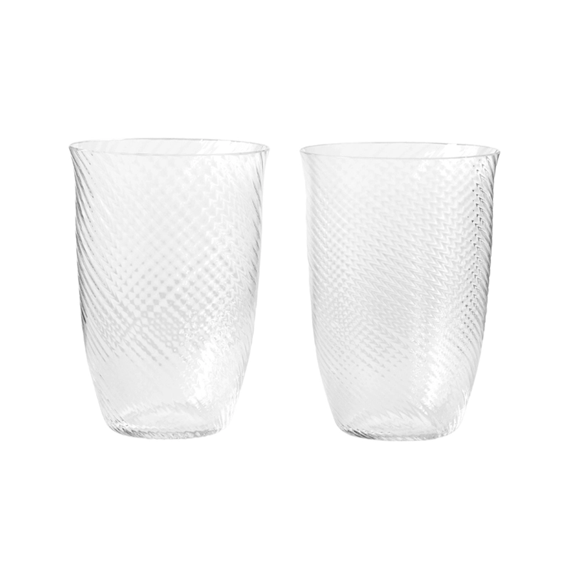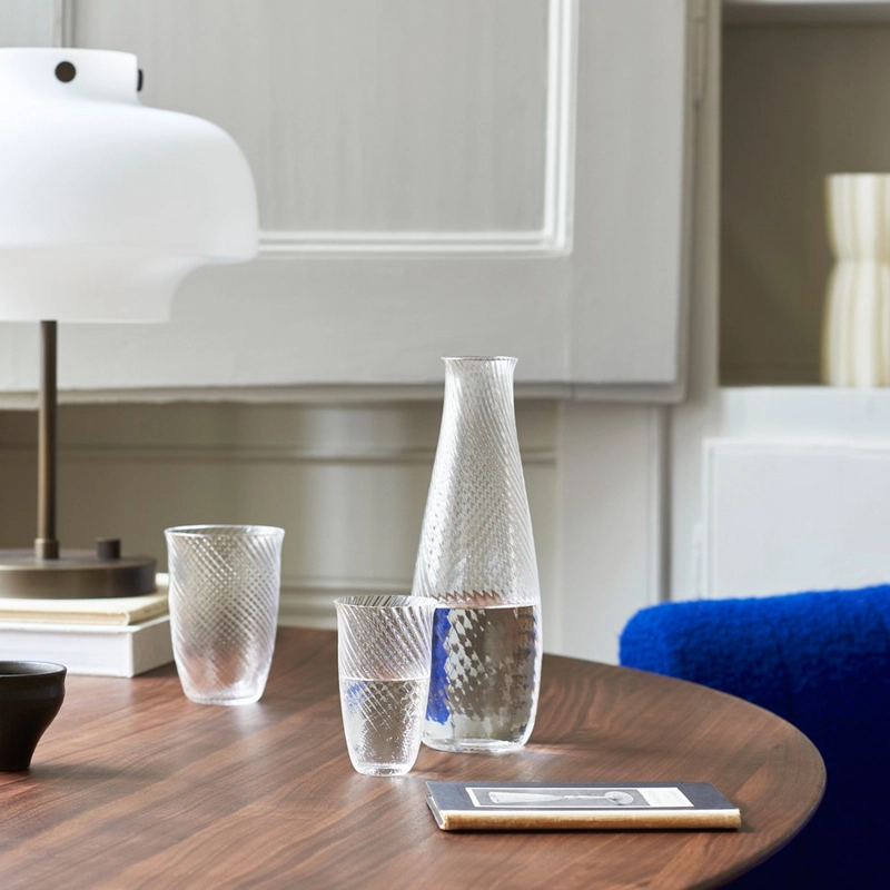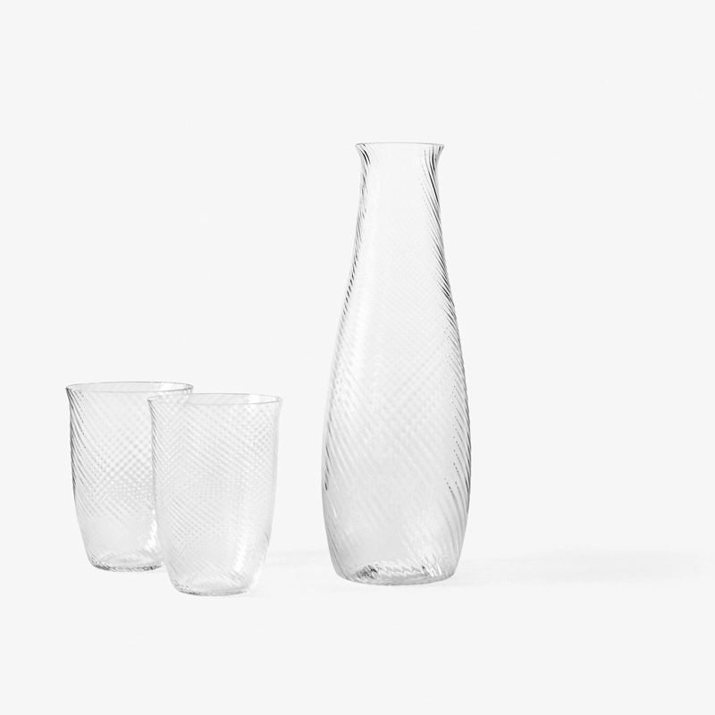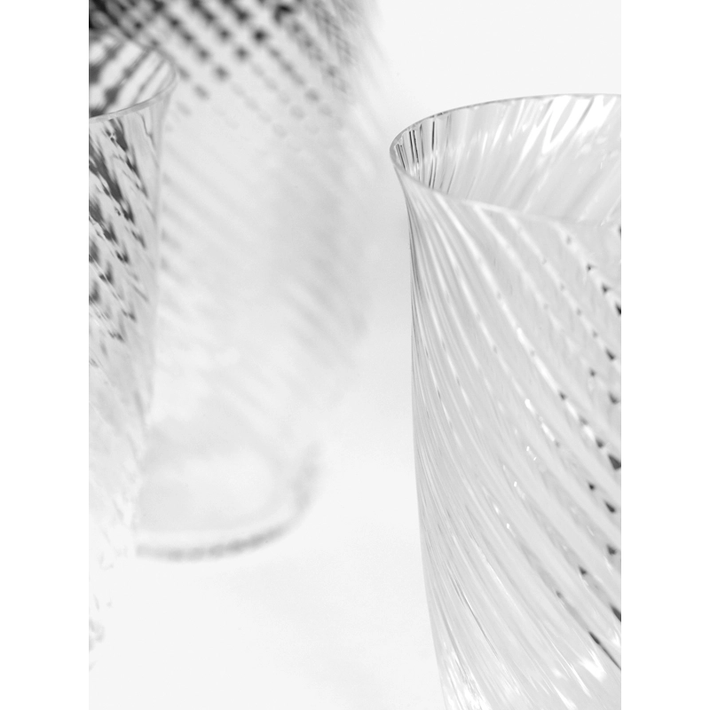 D'apparence simple et résolument moderne, ce set de deux verres présente un subtil motif tourbillon qui reflète la nature tourbillonnante de l'eau. Les verres sont dotés d'un bord évasé qui crée un endroit naturel où la lèvre se repose. Ils font partie de Collect, une collection de tissus d'ameublement et d'objets de maison magnifiquement conçus par Space Copenhagen pour And Tradition. Décliné en deux tailles, chaque modèle est vendu par paire. Une carafe de la même collection est également disponible pour créer un ensemble très raffiné.