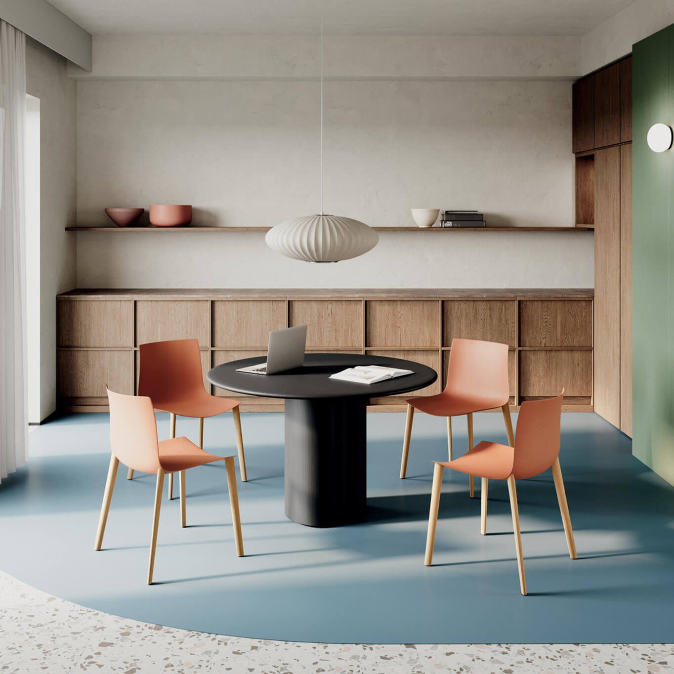 Catifa 46 est une pierre angulaire de l'identité d'Arper – une icône durable qui a introduit un nouveau langage dans le monde du design dès ses débuts. Ses dernières évolutions reflètent sa capacité à s'adapter en permanence aux besoins changeants. Aujourd'hui, Catifa 46 est réinterprétée avec une coque fabriquée à partir de plastique 100 % recyclé, provenant d'un mélange de déchets post-consommation et post-industriels. Avec ce nouveau matériau, une texture et une palette de couleurs fraîches font leur apparition, inspirées de l'architecture durable : des matériaux exposés, authentiques et naturellement texturés, qui apportent de la profondeur et de la chaleur à la coque. Plus qu'un simple aspect visuel, l'expérience est également tactile. À l'arrière de la coque, des nuances se fondent avec une texture unique qui rappelle l'innovation bicolore ayant initialement défini Catifa, ajoutant ainsi encore plus de caractère et d'identité à Catifa (RE) 46.