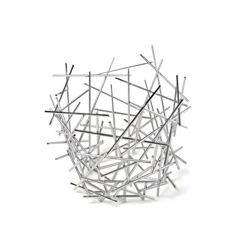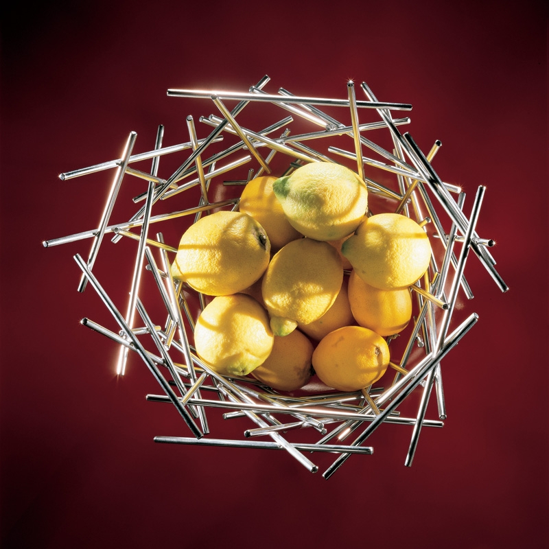 Blow up est un porte-fruits en acier inoxydable 18/10 brillant dessiné par les célèbres frères Fernando et Humberto Campana pour Alessi en 2004. Les designers jouent sur les pleins et les vides pour donner de la nouveauté, de la fraîcheur et de la poésie à cette corbeille. Sa forme si singulière est créée par les bâtonnets d'acier qui semblent avoir été assemblés au hasard, trait qui est caractéristique à de nombreux projets des frères brésiliens. Aussi beau rempli de fruits que vide, Blow up trouvera facilement sa place dans la cuisine ou dans le salon.