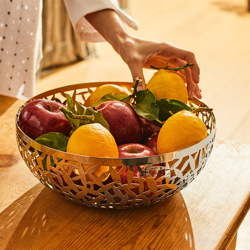 Cactus! est une série d'accessoires pour la maison créée par Marta Sansoni. Cette collection se distingue par le découpage minutieux de l'acier en motifs particuliers et intrigants. La corbeille à fruits Cactus! est ajourée au laser et se décline en version inox ou colorée à la résine époxyde. Disponible en deux tailles, la corbeille change d'aspect en fonction de ce qu'elle contient. Editée par Alessi, cette corbeille est une idée de cadeau élégante , originale et design !
