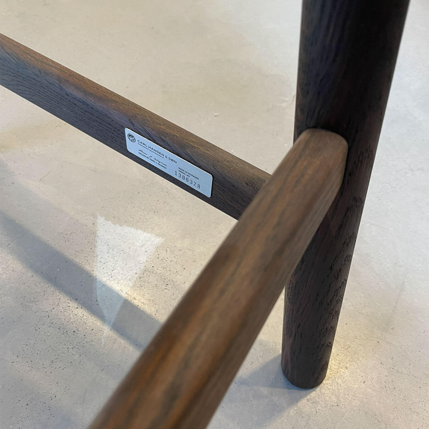 CH47 Chair d’occasion de la marque Carl Hansen & Søn est une magnifique chaise dessinée par le maître du design danois Hans J. Wegner. Cette version prestigieuse est réalisée en chêne massif teinté foncé, associée à une assise en corde naturelle et complétée par un coussin en cuir sellier cognac. Confortable et imposante, la structure affiche une largeur généreuse, environ 55 cm, offrant une sensation d’espace et d’accueil. Derrière sa silhouette simple et raffinée, cette chaise révèle une sophistication remarquable : l’équilibre de ses volumes, la qualité des matériaux et la précision artisanale témoignent de l’exigence de Wegner. Fabriquée au Danemark dans l’esprit traditionnel de la marque, la CH47 d’occasion reste un choix d’exception pour habiller un intérieur contemporain ou un espace design, en alliant esthétisme, confort et héritage du meuble scandinave.