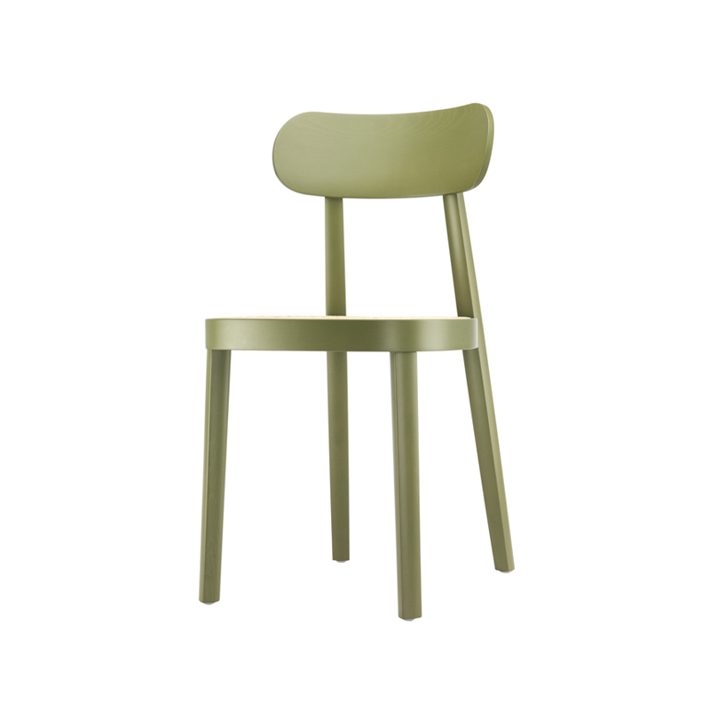 chaise 118 Thonet est ainsi particulière : leur arrondi à l’arrière est brisé par des arêtes courbes sur le devant, créant des lignes qui reprennent la forme en fer à cheval de l’assise. La chaise avec une assise en auge