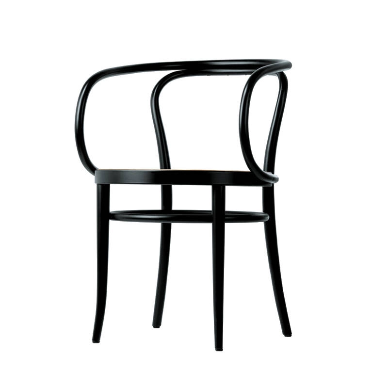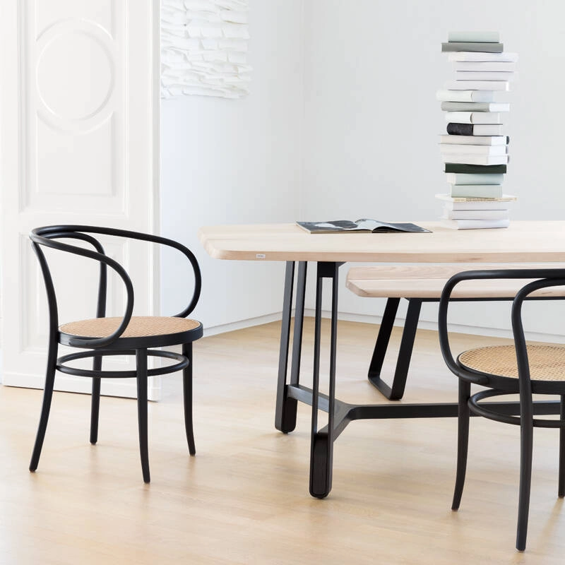 Thonet, cet élégant classique en bois courbé est un chef-d’œuvre en termes de conception et de fabrication : le dossier et les accoudoirs sont formés d’un unique cadre en porte-à-faux courbé, fabriqué d’une seule pièce de hêtre massif. Comme l’original en bois courbé n° 214, conçu par les frères