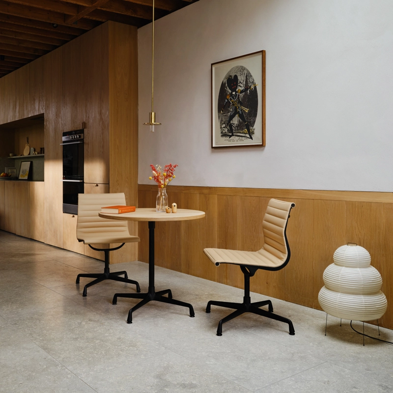 Dessiné par Ray et Charles Eames, le fauteuil Aluminium Group est l'une des créations majeures du design du 20ème siècle. Sa principale caractéristique est son assemblage judicieux des matériaux pour atteindre un confort optimal : le revêtement est fixé et tendu sur les profilés d'aluminium latéraux, devenant ainsi un élément porteur de la structure. Vitra réédite à présent les modèles EA 101, 103 et 104, trois versions de ce classique du design, qui faisaient partie de la famille de produits d'origine et étaient commercialisés sous le nom de « Aluminium Dining Chairs ». Elles complètent ainsi la gamme de l'Aluminium Group par une sélection de chaises plus petites et plus légères, idéales autour d'une table.