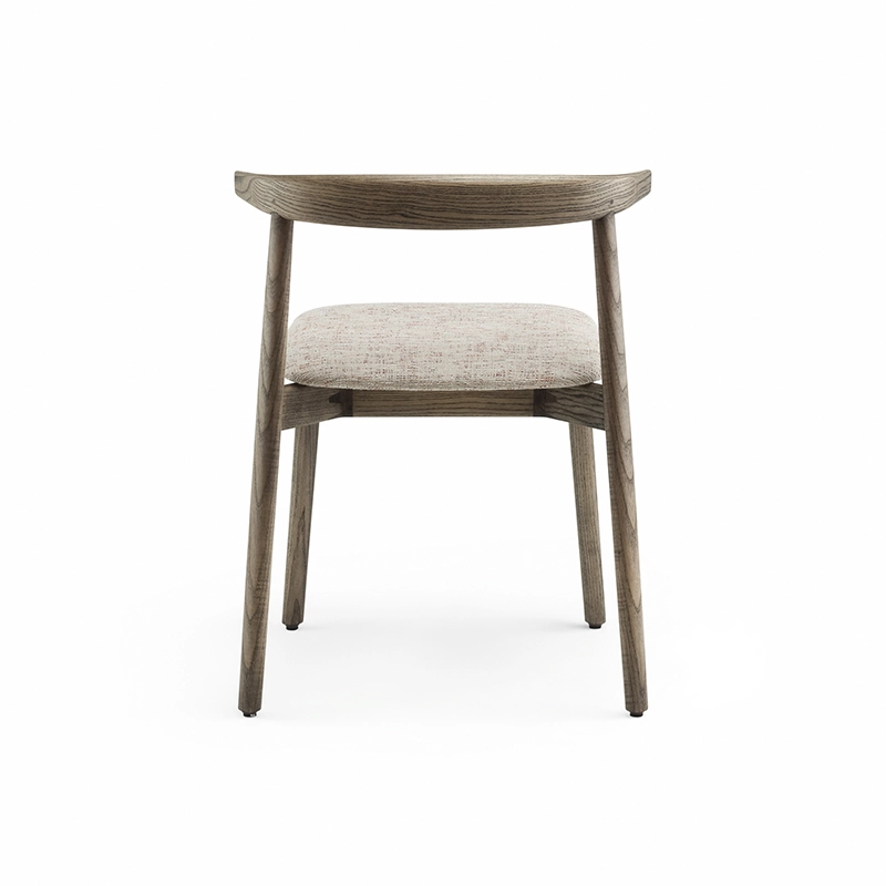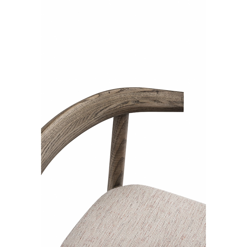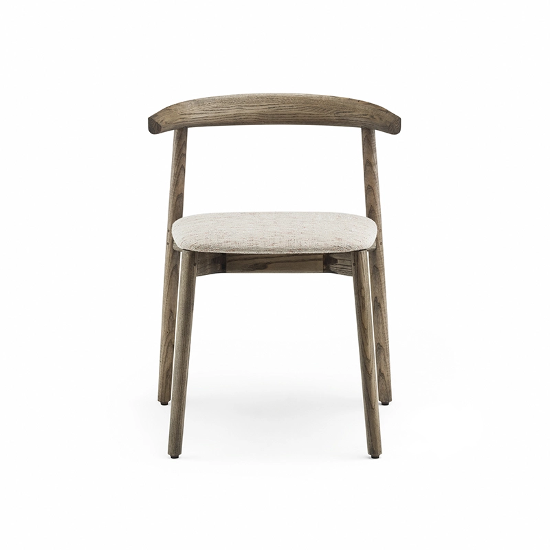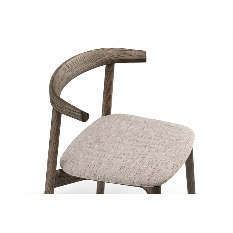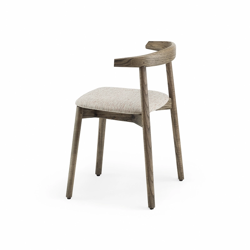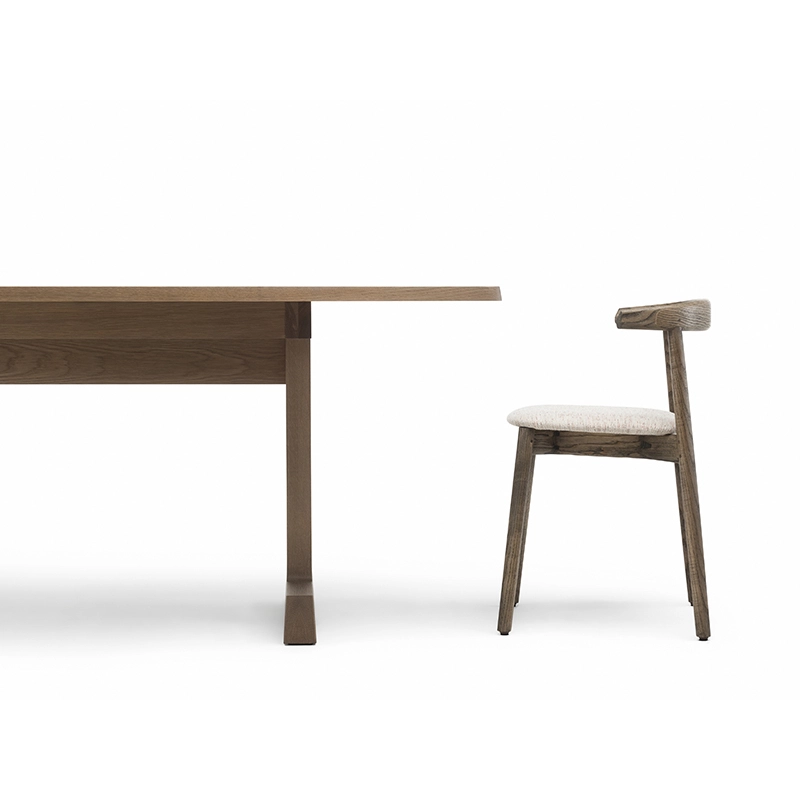 La chaise rembourrée Ando de De La Espada est une conception utilitaire, robuste et silencieuse avec de beaux détails. C'est une chaise de salle à manger relativement compacte avec de la force et de la personnalité tout en restant sobre. Le dos est composé de plusieurs pièces de bois, jointes et sculptées, mettant en valeur les variations naturelles du grain du matériau. L'assise est adoucie par le rembourrage pour plus de confort.