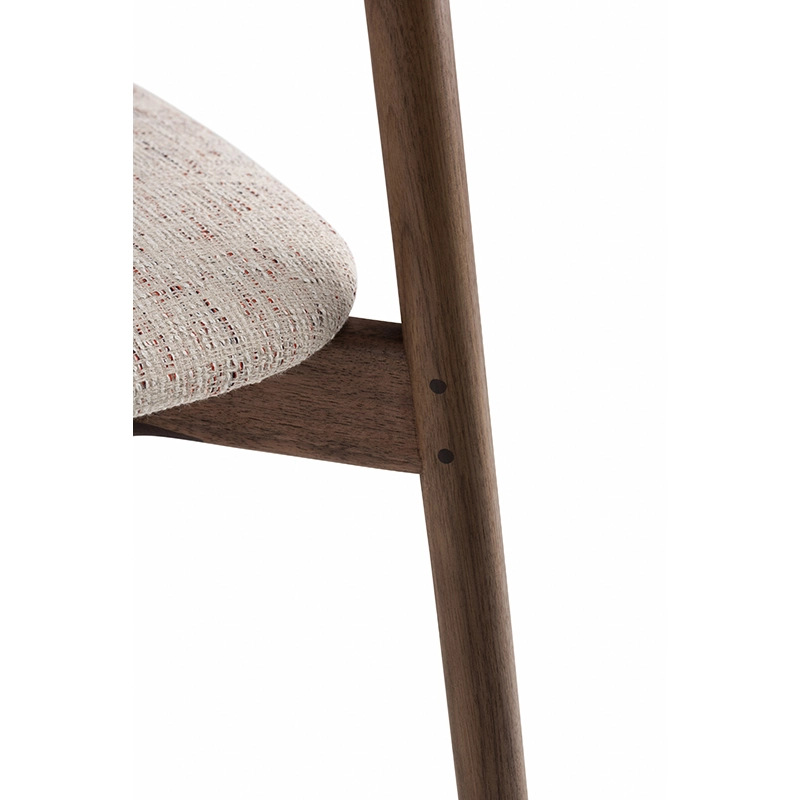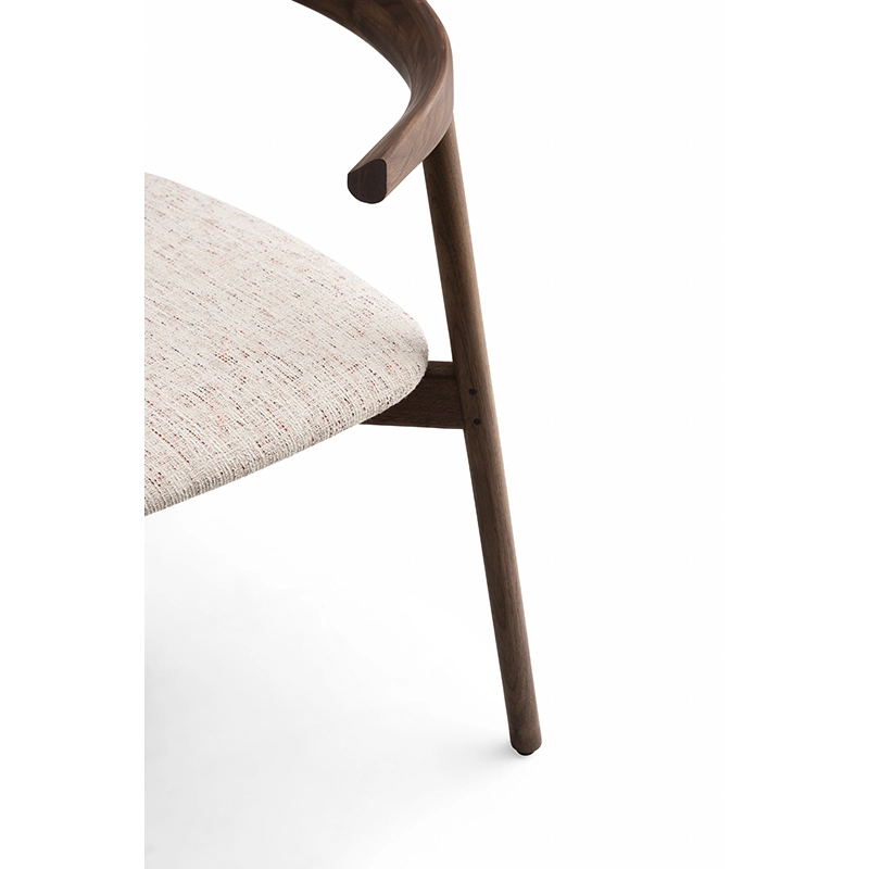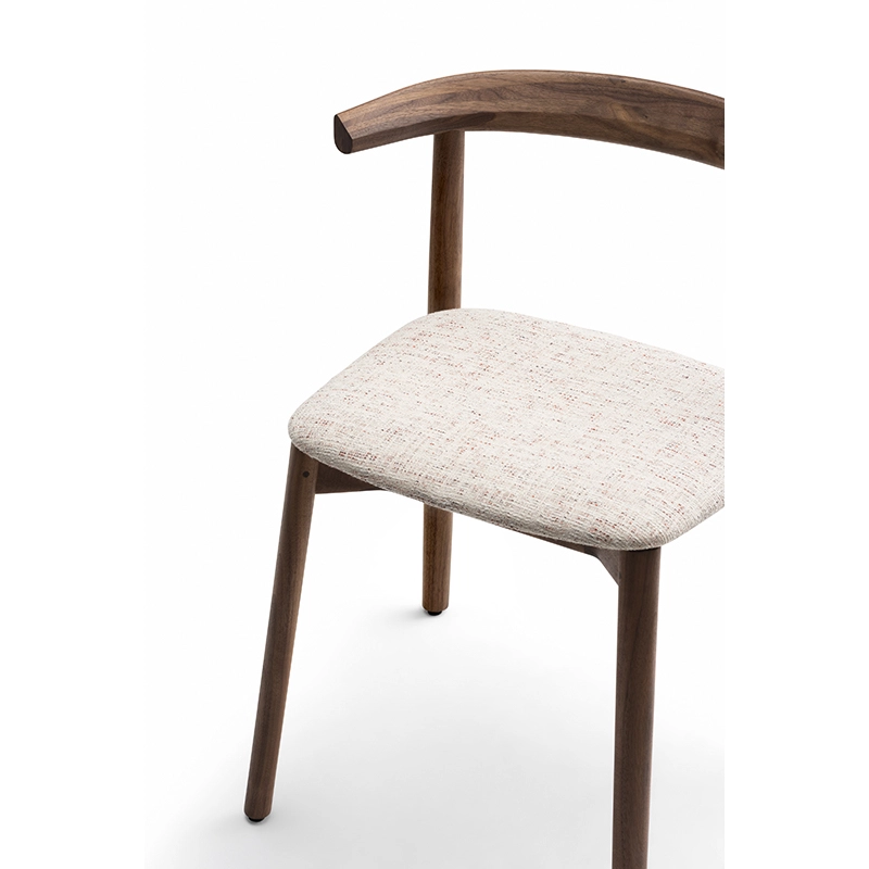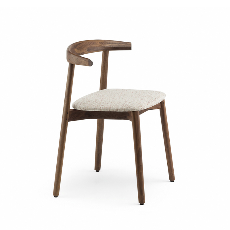 La chaise rembourrée Ando de De La Espada est une conception utilitaire, robuste et silencieuse avec de beaux détails. C'est une chaise de salle à manger relativement compacte avec de la force et de la personnalité tout en restant sobre. Le dos est composé de plusieurs pièces de bois, jointes et sculptées, mettant en valeur les variations naturelles du grain du matériau. L'assise est adoucie par le rembourrage pour plus de confort.