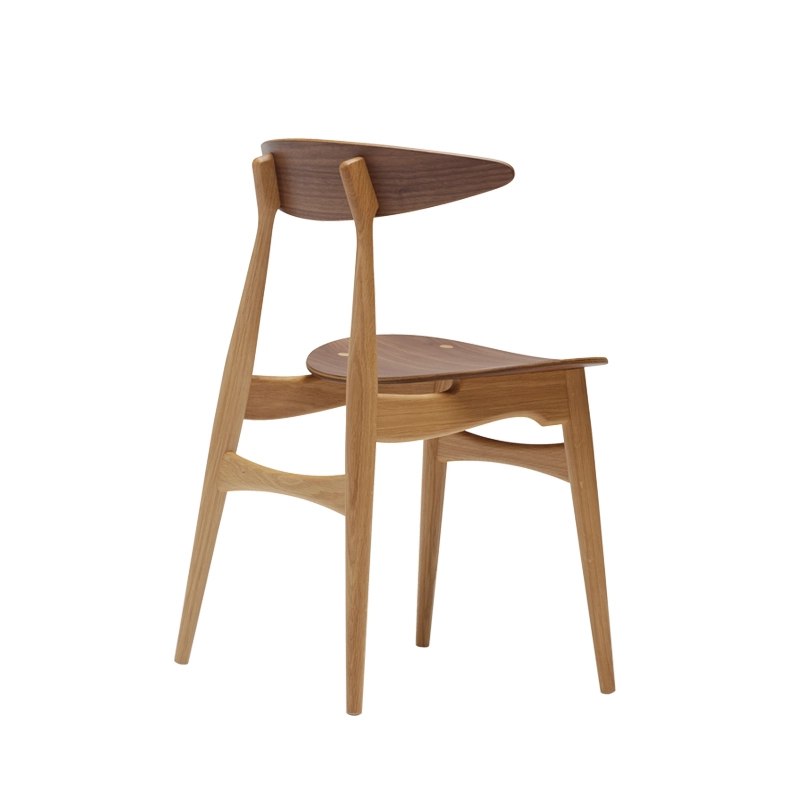 Légère et sculpturale, la chaise CH33T de Hans J. Wegner est basée sur les idées et les formes qui sont typiques de ses meilleures créations. La chaise a été conçue en 1957 pour Carl Hansen & Søn, où elle a été fabriquée pendant dix ans. Avec une pause d'environ 45 ans, la production a repris en 2012. Le design de CH33T a du caractère et des formes organiques claires. La hauteur, la profondeur et les angles de la chaise CH33T sont soigneusement définis pour s'adapter à l'occupant et les dimensions du bois sont choisies en fonction des facteurs jugés nécessaires par Wegner. Le dossier aux courbes caractéristiques est en placage pressé avec des capuchons ronds visibles. La construction en bois de la chaise Wegner a un aspect vibrant qui se prête aux intérieurs modernes.
