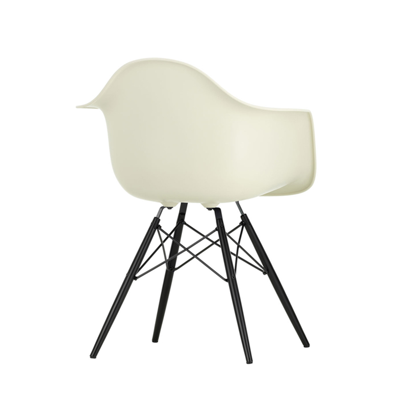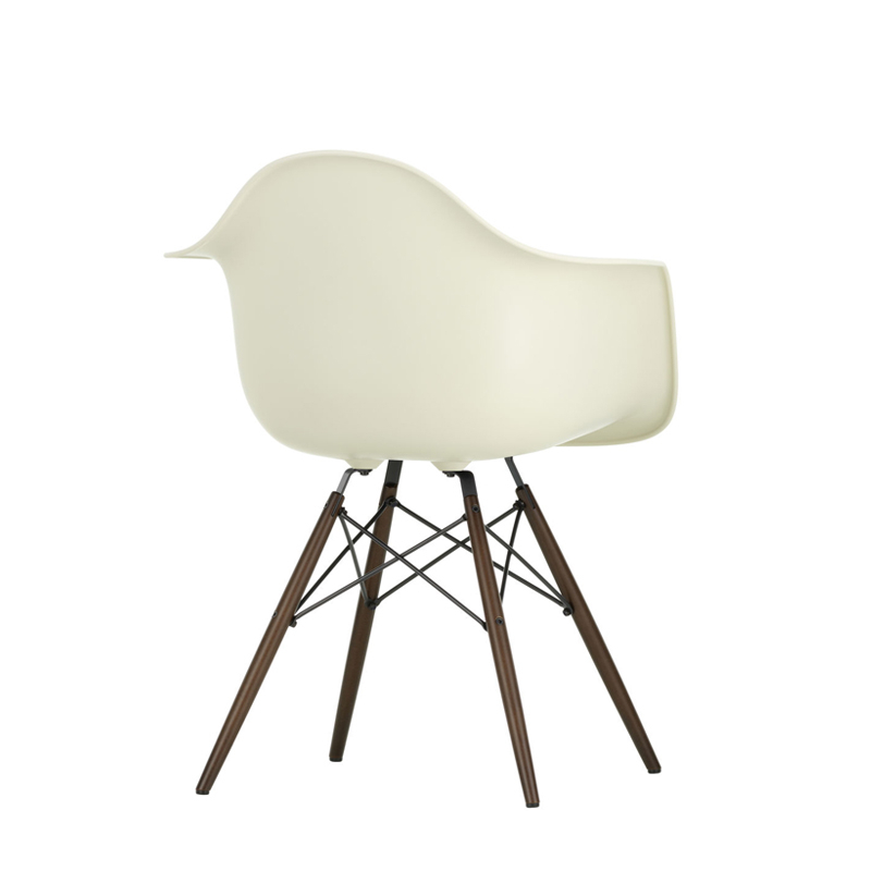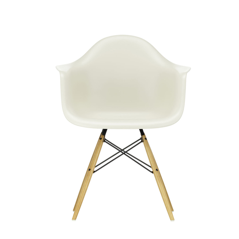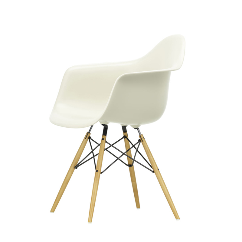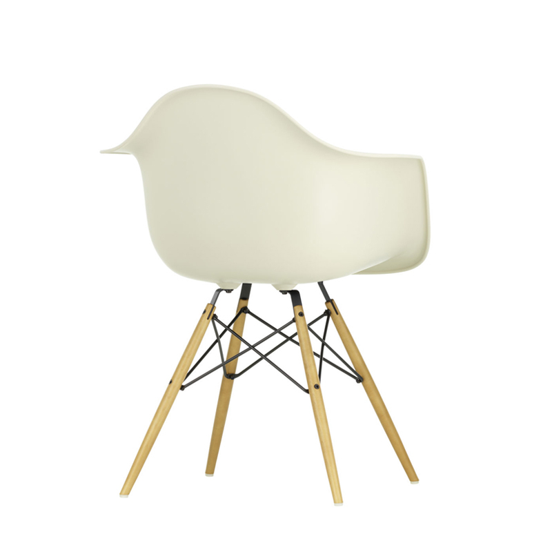 Les Plastic Armchairs dessinés par Charles et Ray Eames dans les années 50 ont été présentés pour la première fois dans le cadre du concours « Low Cost Furniture Design » organisé par le Museum of Modern Art de New York. La Eames Plastic DAW (Dinig Armchair Wooden base) possède une coque aux lignes organiques qui était à l'origine en fibre de verre. Rééditée par Vitra avec une coque en polypropylène, elle offre toujours un grand confort à un prix accessible. Le piètement est composé de quatre pieds en érable teinté et laqué avec des croisillons en tube d'acier. C'est un petit fauteuil idéal pour des repas qui se prolongent.