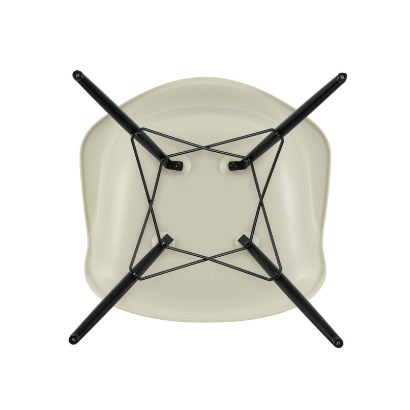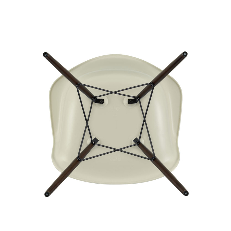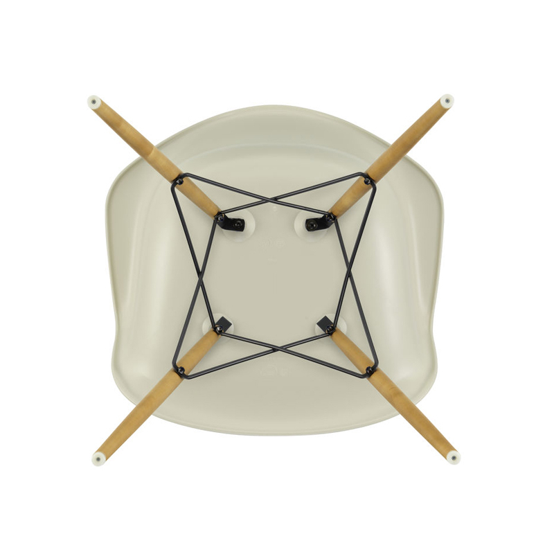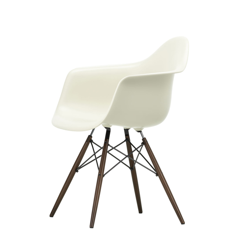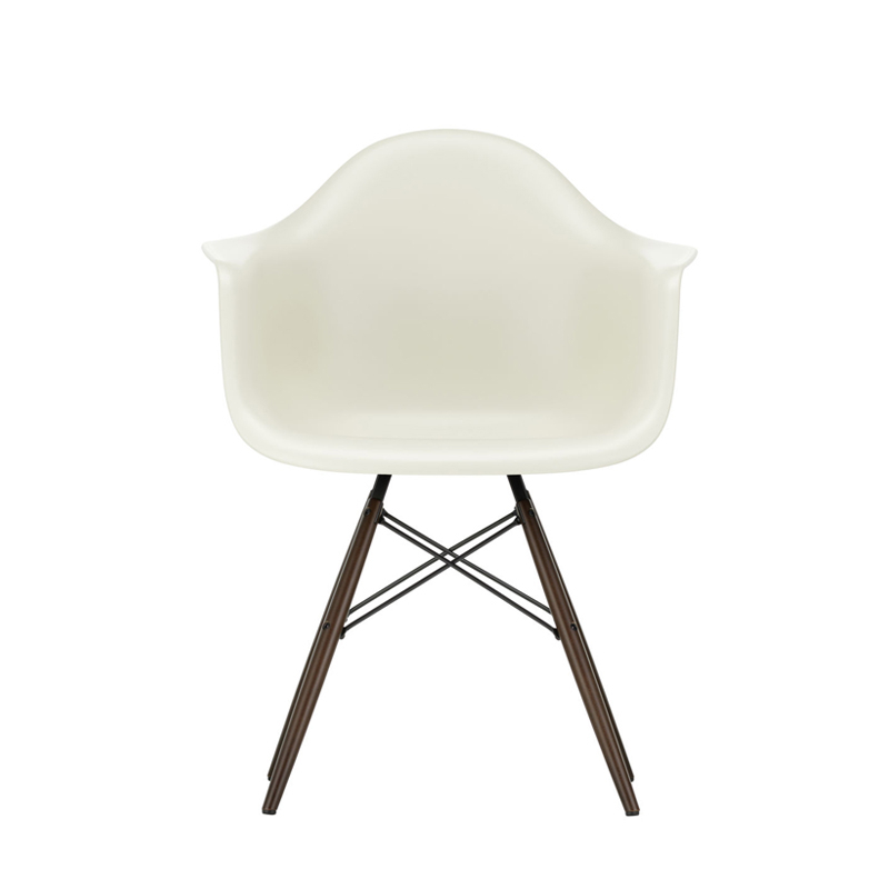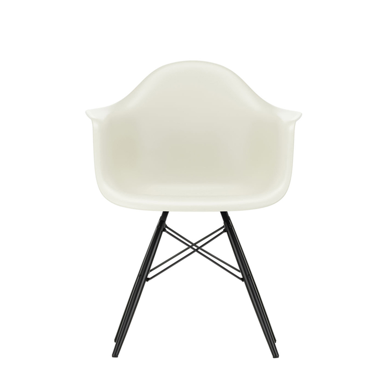 Les Plastic Armchairs dessinés par Charles et Ray Eames dans les années 50 ont été présentés pour la première fois dans le cadre du concours « Low Cost Furniture Design » organisé par le Museum of Modern Art de New York. La Eames Plastic DAW (Dinig Armchair Wooden base) possède une coque aux lignes organiques qui était à l'origine en fibre de verre. Rééditée par Vitra avec une coque en polypropylène, elle offre toujours un grand confort à un prix accessible. Le piètement est composé de quatre pieds en érable teinté et laqué avec des croisillons en tube d'acier. C'est un petit fauteuil idéal pour des repas qui se prolongent.