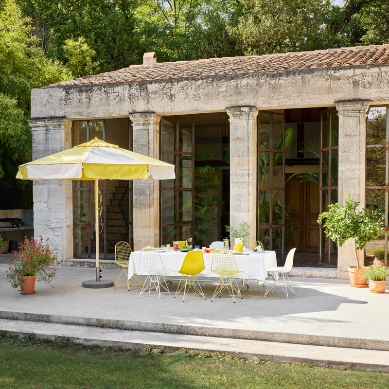 La Eames Plastic Side Chair est la version actualisée de la légendaire Fiberglass Chair des designers américains Charles et Ray Eames. Cette chaise Eames Vitra est une relecture de la première chaise en plastique produite en série. Conçue en collaboration avec Zenith Plastics pour le concours « Low Cost Furniture Design » du Museum of Modern Art de New York en 1948, elle fut la première chaise en matière plastique de fabrication industrielle. Les formes naturelles et l’aspect fonctionnel sont des traits caractéristiques du couple de designers Eames que l’on retrouve pleinement dans le design de la chaise DSR (Dining Side chair Rod base). Editée par Vitra, la Eames Plastic Chair DSR se distingue comme une pièce incontournable avec la construction de sa structure en tiges de métal. En effet, la chaise Eames Vitra possède un piétement chromé avec ses tiges métalliques entrelacées. Ce dernier est entré dans l’histoire sous le nom de pieds « Tour Eiffel ».  S'inspirant de la palette de couleurs développée par Charles et Ray Eames, Vitra a défini quatre combinaisons de teintes pour la coque d'assise et le piètement Tour Eiffel du modèle DSR : moutarde et citron, bleu de mer et bleu ciel, forêt et vert foncé, ainsi que gris galet et Eames Sea Foam Green. Cette version peut être utilisée aussi bien à l’intérieur qu’à l’extérieur.