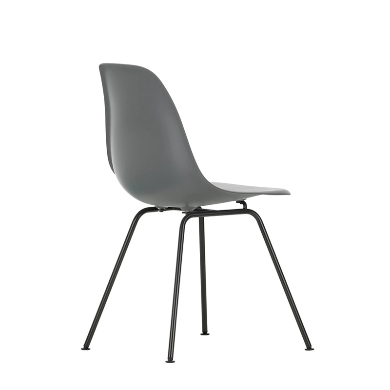Les Plastic Armchairs dessinés par Charles et Ray Eames dans les années 50 ont été présentés pour la première fois dans le cadre du concours « Low Cost Furniture Design » organisé par le Museum of Modern Art de New York. La coque aux lignes organiques était à l'origine en fibre de verre. Rééditée par Vitra avec une coque en polypropylène, La chaise DSX (Dining Height Side Chair X-Base) à l'esthétique sobre se définit par un piètement à quatre pieds en tube d'acier et une coque aux formes organiques disponible en une large palette de couleurs. Le piètement se décline en version chromée ou finition époxy noir qui est adapté aussi à une utilisation à l'extérieur. La chaise DSX s'adapte aussi bien aux espaces domestiques qu'aux environnements collectifs. En adoptant le polypropylène moulé, Vitra en a amélioré à la fois la robustesse, l'élasticité et le confort. À partir d'une unique forme de coque, la chaise est déclinée en trois grandes familles caractérisées par la forme du piètement : la chaise Eames DSR avec piètement Eiffel, la chaise Eames DSW avec piètement à croisillons de bois et la chaise Eames DSX à piètement tubulaire simple. Les chaises Eames DSXE sont disponibles en plusieurs couleurs, avec ou sans coussin d'assise ou rembourrage intérieur.