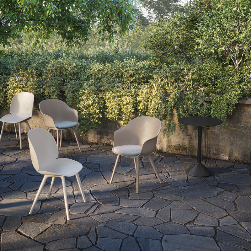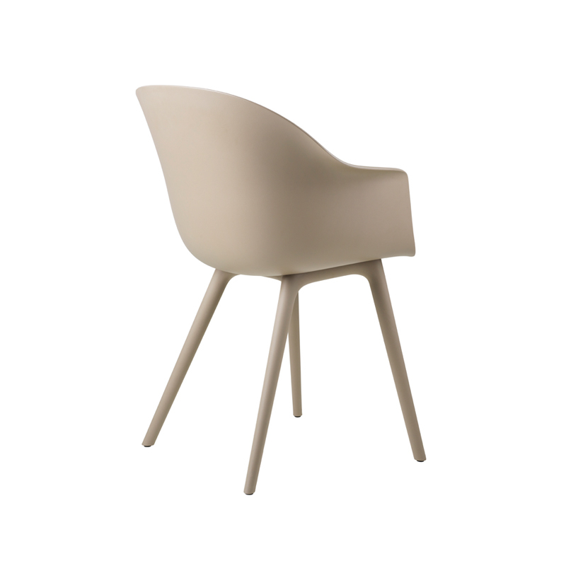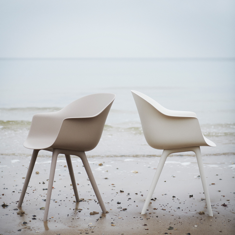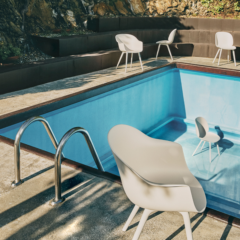 Conçue par le célèbre studio Gamfratesi pour la marque Gubi, la version plastique du petit fauteuil Bat a été réimaginée pour une utilisation à l'extérieur. Un nouvel examen des matériaux, de l'esthétique et de la fonction ont mené à l'ajout d'un traitement pour l'extérieur, ouvrant de nouvelles possibilités et rendant ces chaises parfaites aussi bien pour l'extérieur que l'intérieur. Des additifs spéciaux ajoutés au polypropylène moulé permettent d'empêcher la décoloration due aux changements de temps. Grâce à la légèreté du matériau, les chaises Bat se déplacent facilement, faisant ainsi tomber les barrières entre les espaces intérieurs et extérieurs.