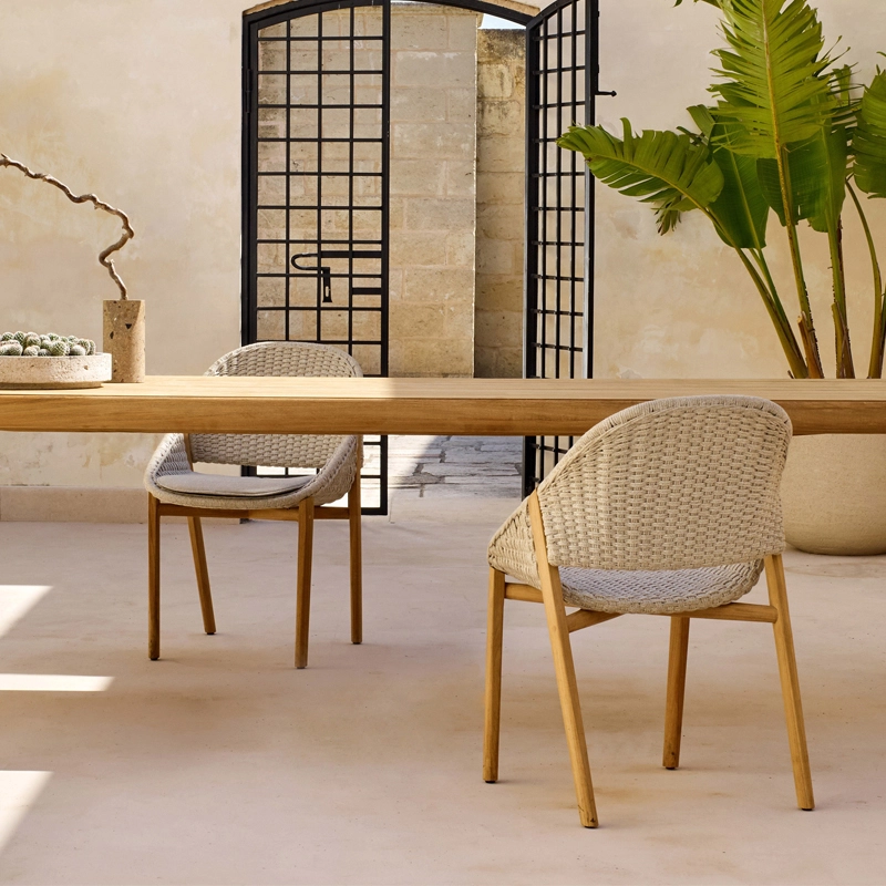 En référence à Hélios le dieu grec du soleil, Elio, imaginé par Yabu Pushelberg et éditée par Tribu, vise à capturer un moment universellement familier et fugace : le coucher de soleil. Elio capture ses teintes éclatantes et soyeuses dans le ciel au crépuscule. La collection Elio, tissée à la main, se matérialise en une silhouette légèrement arrondie qui s'ouvre vers l'intérieur pour créer un effet cocon, parée des couleurs subtiles et naturelles d’un dossier en Tricord tressé. Les fauteuils de la collection Elio ont été conçus avec une structure en teck naturel qui soutient l'assise, principalement grâce aux pieds arrière. Accueillant et confortable, le tressage allie techniques textiles traditionnelles à la teinture en solution contemporaine, pour créer un effet de matière qui imite à la perfection l'éclat délicat de la lumière. Le tissage est disponible dans les teintes lin, wengé et mousse.