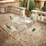 La collection Heaven, dessinée par Jean-Marie Massaud pour Emu, est une ligne de produits qui a su associer des formes importantes à une harmonie élémentaire des proportions, pour un résultat à la fois chic et très équilibré. Le designer a utilisé le savoir-faire de la maison Emu dans le travail du métal pour insuffler une énergie nouvelle a ce matériau. L'acier y est tressé comme un tissu, par le biais d'un seul processus automatisé de soudage, donnant une impression de grande légèreté et de volume incorporel. La coque de la chaise est moulée pour s'adapter parfaitement au corps et offrir un confort optimal. Pour la table, c'est le pied qui est tressé en une seule pièce, sur laquelle repose un plateau en verre gris fumé ou transparent. Heaven est une collection originale et surprenante par ses formes et son jeu de transparence visuelle, qui s'utilise sur une terrasse, dans le jardin et pourquoi pas à l'intérieur de votre maison.