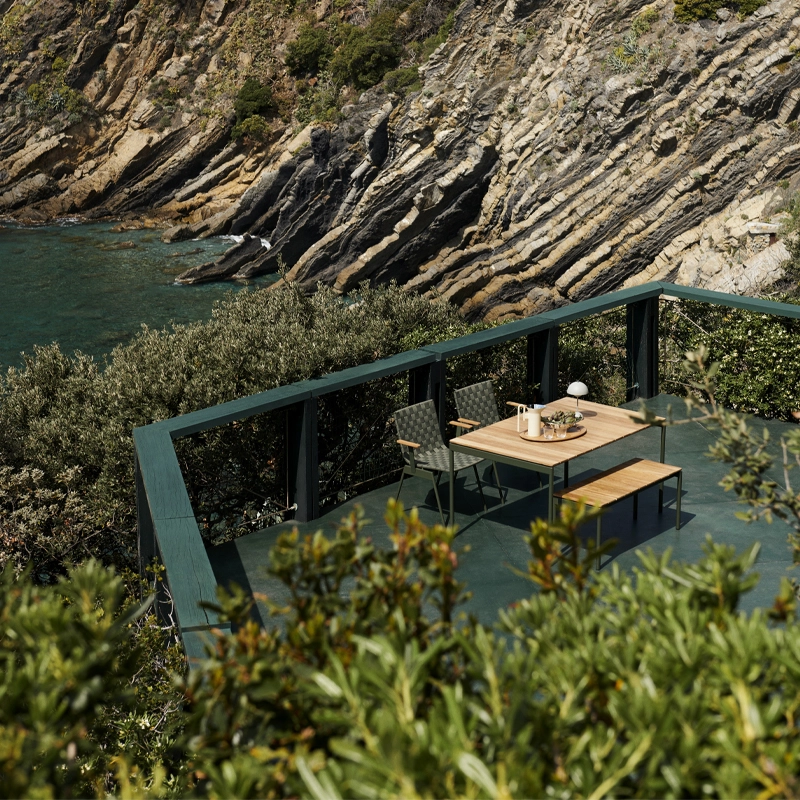 Célébration de la nature et de la matérialité, Ville de And Tradition est une collection de meubles pour l'extérieur combinant solidité et douceur. Comparé à une « poignée de main ferme et chaleureuse », le teck a été choisi pour les chaises Ville pour son toucher accueillant, et la sangle en polyester pour son confort et sa capacité à s'adapter à la température du corps. Intuitivement conçu pour répondre aux besoins uniques des établissements d'accueil ou pendant les mois les plus froids à la maison, la chaise Ville s'empile jusqu'à 8 pièces.
