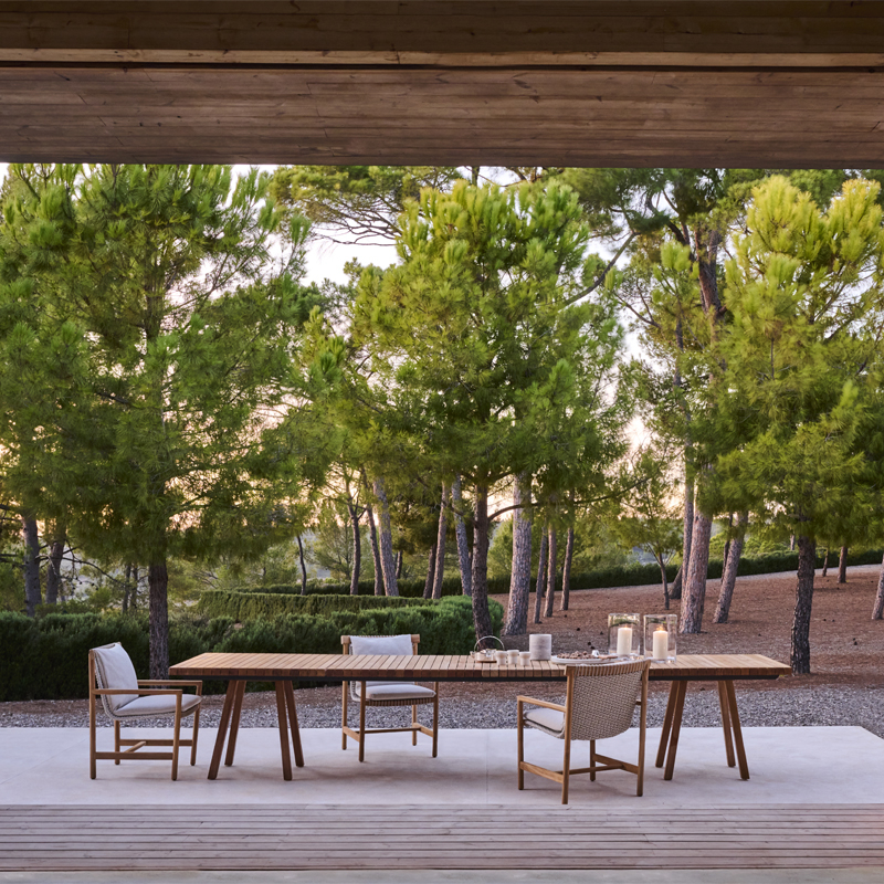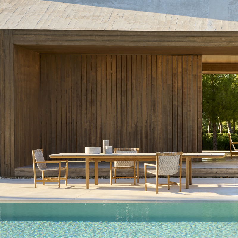 La collection raffinée Amanu créée par les designers de Yabu Pushelberg et éditée par Tribu apporte la qualité du mobilier d’intérieur à l'extérieur, tout en combinant confort et durabilité. Amanu résulte d’un long travail d’affinement, jusqu’à l’obtention de sa forme la plus essentielle, inspirant pureté et calme. Les fauteuils sont dotés d'une assise en tissage Canax à base de chanvre qui semble flotter sur un cadre fin en teck, provenant de plantations indonésiennes gérées de manière durable. Les pieds légèrement effilés du fauteuil Amanu lui apportent légèreté et grâce, tandis que ses accoudoirs lisses en forme de demi-lune le rendent extrêmement confortable.