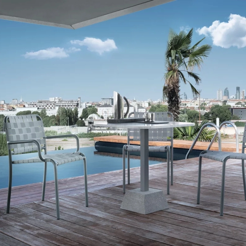 Dessinée par Paola Navone pour la marque Gervasoni, la chaise Inout 824 est basée sur une structure minimaliste en tube d'aluminium laqué gaufré. Cette structure sert de support à un tressage particulier en sangle élastique, un produit innovant à base de caoutchouc synthétique et de propylène. La chaise Inout 824 se distingue ses lignes essentielles et sont tressage qui apporte légèreté et confort. Parfaite pour les jardins et terrasses, la chaise Inout est aussi disponible sans accoudoirs.
