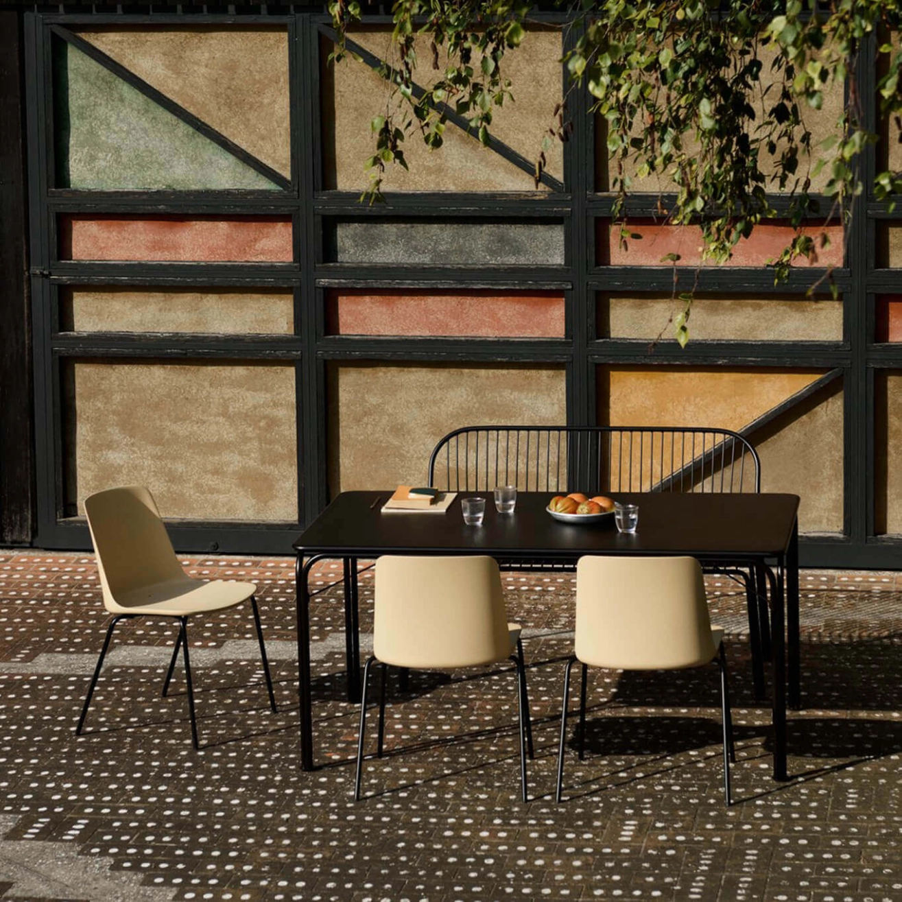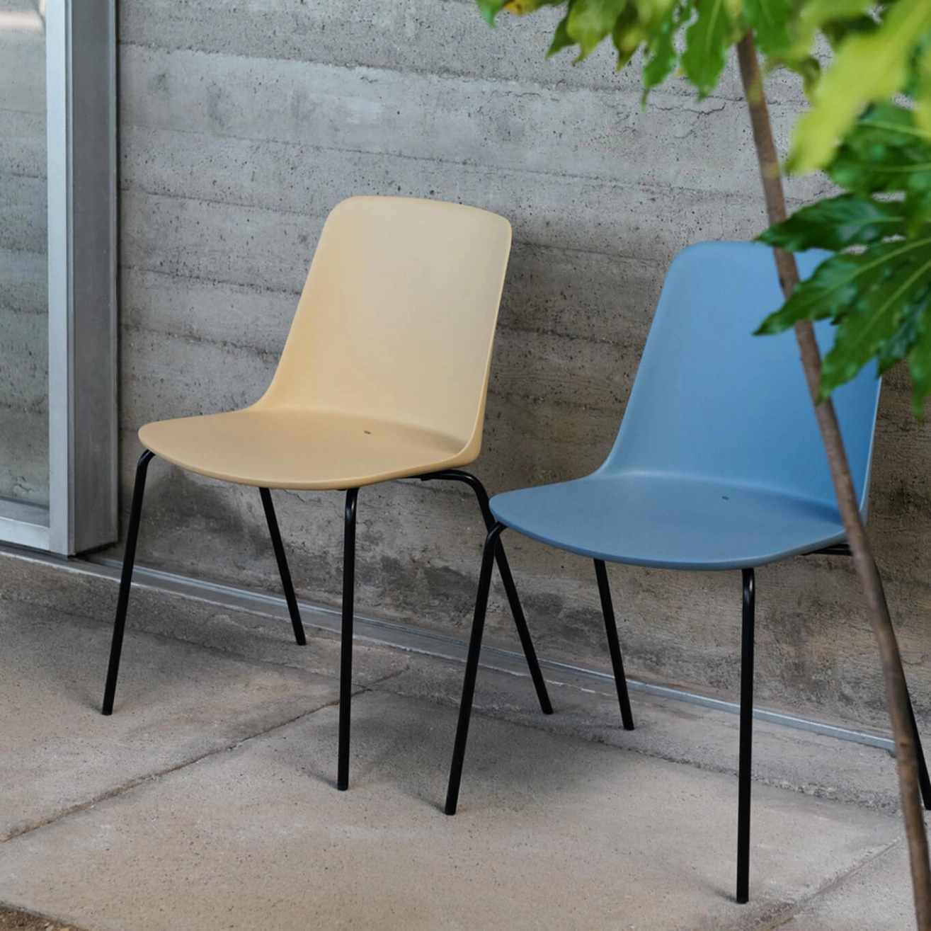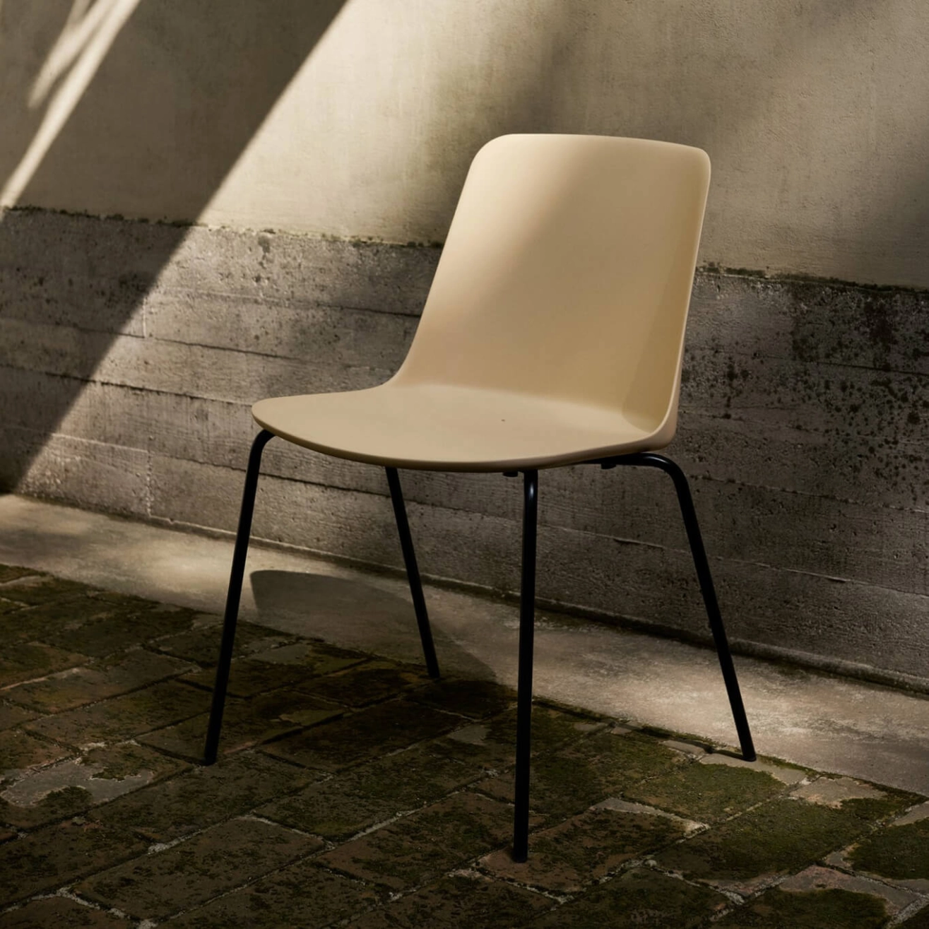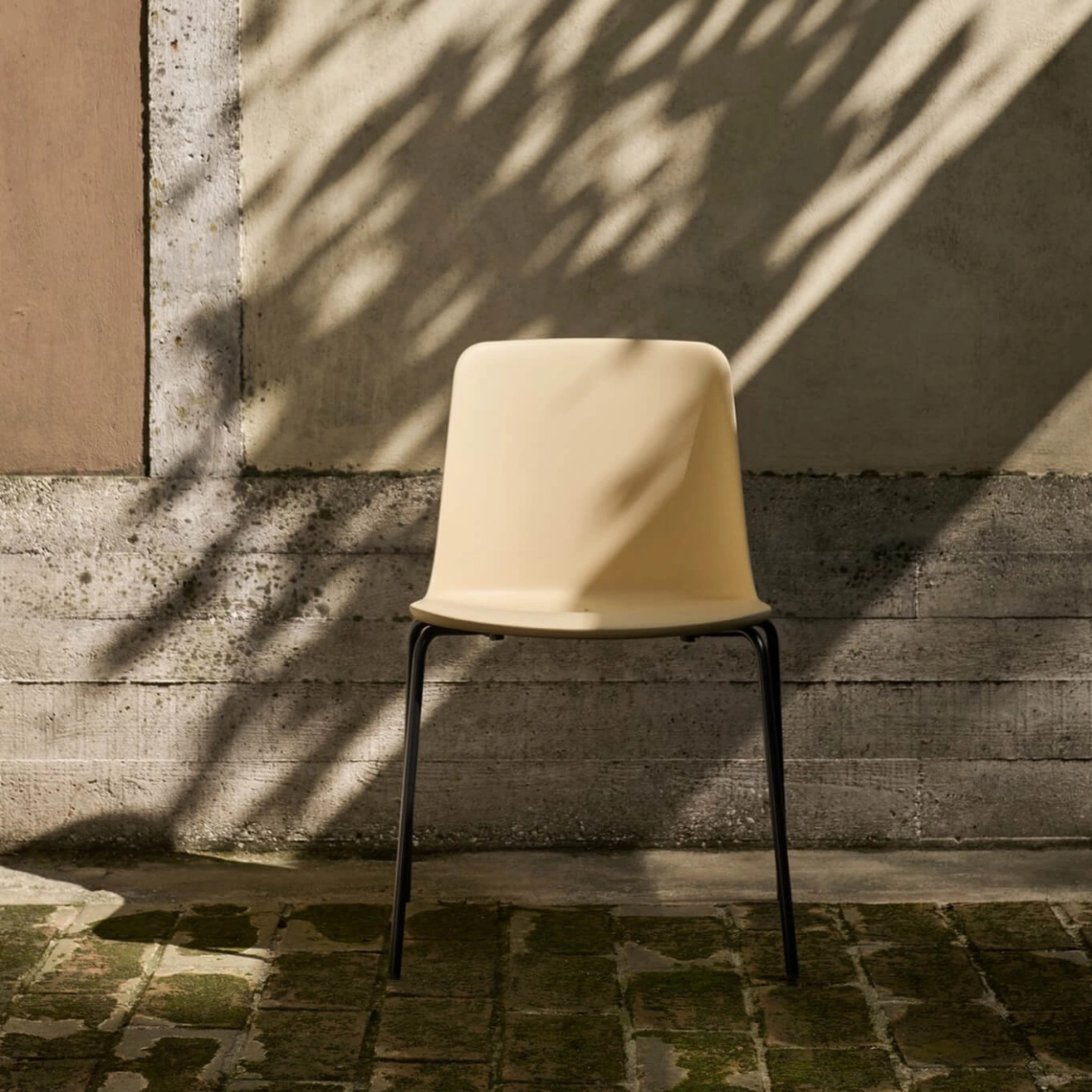 La chaise Rely HW138 Outdoor éditée par &Tradition s’inscrit dans une démarche de design durable. Pour sa conception, le designer danois Hee Welling a accordé une attention particulière au choix des matériaux et à leur cycle de vie. L’apparence simple de la chaise et son design ergonomique incarnent la fusion entre minimalisme et praticité, tout en étant adaptés à une utilisation en extérieur. La coque de la chaise extérieure Rely HW138 est fabriquée en polypropylène recyclé renforcé de fibres de verre et protégé contre les UV, ce qui lui permet de résister aux conditions extérieures. Elle intègre environ 3,4 kg de plastique recyclé, contribuant à remettre ce matériau en circulation. Un petit orifice d’évacuation de l’eau est également intégré à l’assise afin de faciliter l’écoulement de la pluie et de garantir une utilisation durable en extérieur. Le piètement de la Rely HW138 est constitué de tubes d’acier cintrés, puis recouverts d’un revêtement thermolaqué spécialement conçu pour l’extérieur, assurant solidité et résistance aux intempéries. Pensée dans une logique de circularité, la chaise a été conçue pour faciliter la réparation, la rénovation et le recyclage en fin de vie. Chacune des courbes de la Rely HW138 a été développée pour offrir un soutien confortable et équilibré. Fidèle à l’approche de Hee Welling, chaque détail est étudié avec précision afin d’atteindre un résultat harmonieux, où esthétique contemporaine et fonctionnalité se rejoignent.