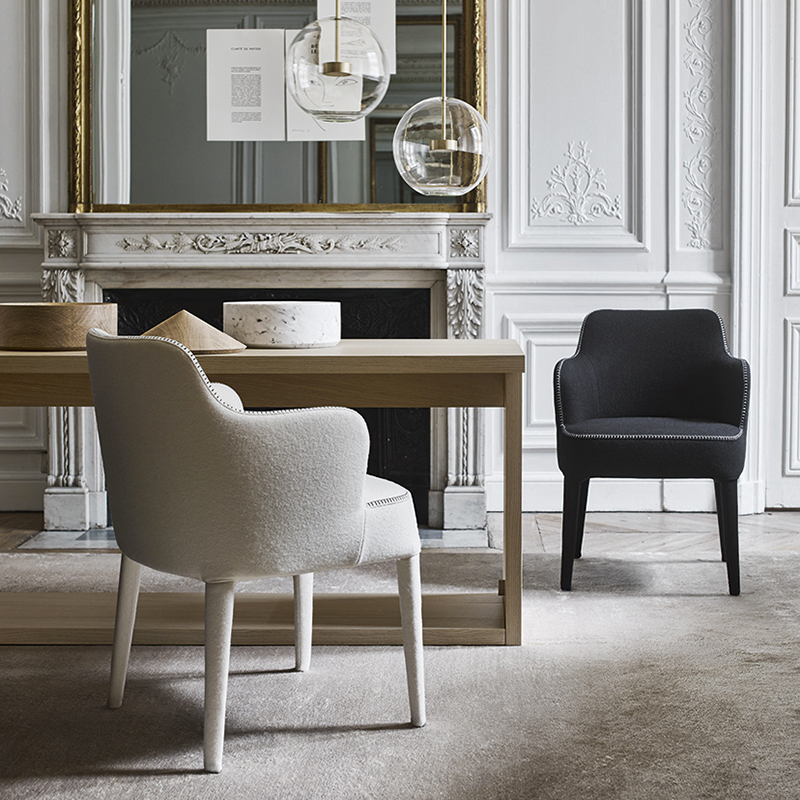 La chaise Febo de Maxalto vient enrichir une collection iconique, comprenant des canapés, fauteuils, chaises longues et lits. Elle est disponible en trois versions : la première avec proportions classiques et un confort extrême, la seconde présente une hauteur réduite de 6 cm, pour pouvoir être placée à côté des tables à thé, et la dernière avec dossier haut et lignes plus enveloppantes. Toutes les chaises Febo sont disponibles avec un revêtement monomatière, en tissu ou cuir avec coutures apparentes à point cavalier, associé à des pieds en chêne gris, chêne clair brossé, chêne noir brossé ou chêne teinte fumé.