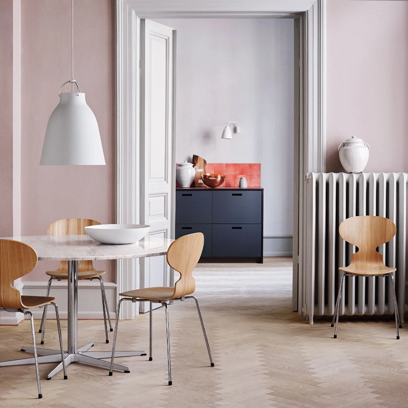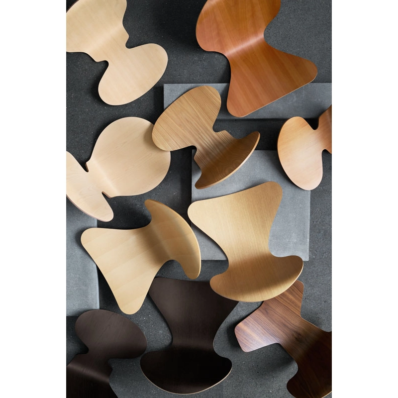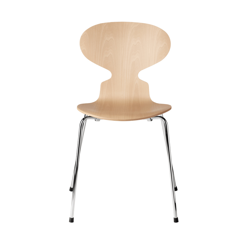 La chaise Fourmi d'Arne Jacobsen est une icône qui ressemble un peu à la forme d'une fourmi avec la tête levée. Sa forme élancée masque sa force.Initialement, Arne Jacobsen dessina les chaises Fourmi pour la cantine du Novo Nordic, un laboratoire pharmaceutique Danois en 1952. Aujourd'hui la chaise Fourmi est une des icônes dominantes de la collection Fritz Hansen. Bien que les formes soient minimalistes, la Fourmi est une chaise extrêmement confortable. C'est une chaise empilable montée sur un piétement à quatre pieds en tube d'acier inoxydable satiné. La coque est faite de placage moulé sous pression - sept couches de placage intérieur et deux couches de placage extérieur, à l'avant et à l'arrière de la coque.