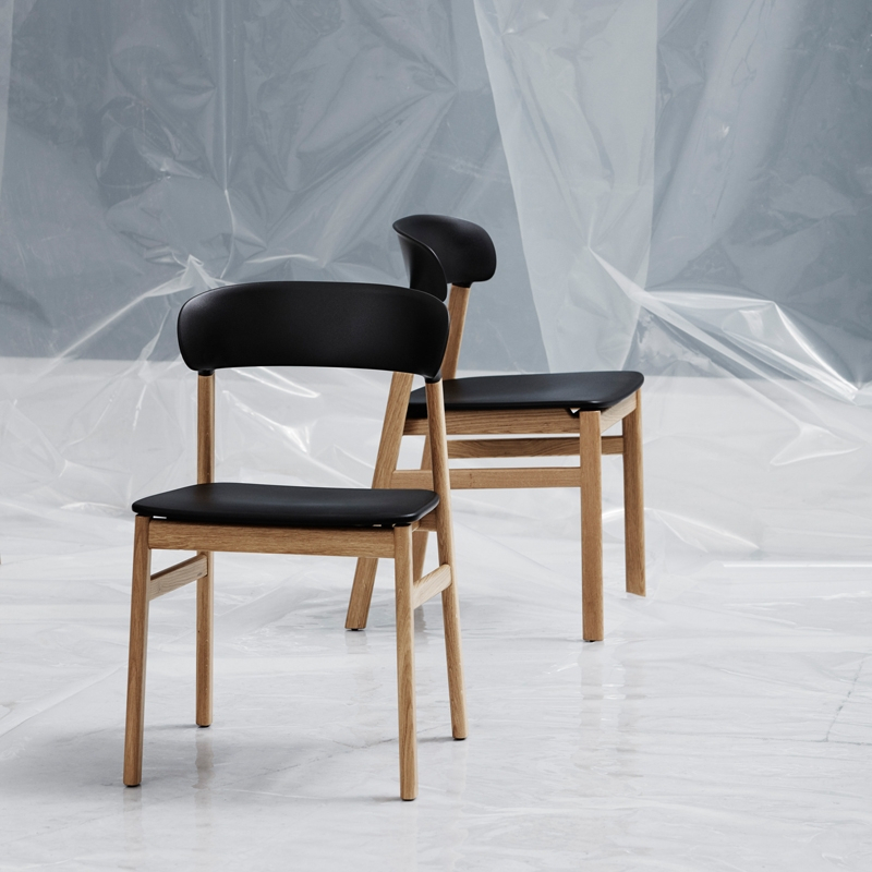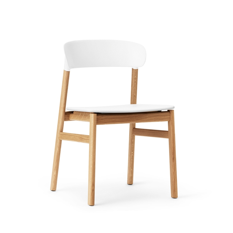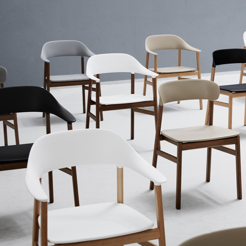 Herit, qui est l'abréviation du mot héritage, reflète l'amour de Simon Legald pour la tradition du design danois. Cette gamme de sièges s'harmonise parfaitement avec la volonté du designer de concevoir une chaise polyvalente et solide qui associe différentes époques du design de ses origines tout en suivant la philosophie de Normann Copenhagen. Mais Herit est également un objet tourné vers le futur. Des méthodes de production innovantes, une nouvelle composition des matériaux et des lignes intemporelles définissent cette gamme de chaises conçues pour la vie moderne. Herit allie le bois de chêne et le plastique solide en une synergie délicate, pour créer un objet robuste, facile à entretenir et accessible. Disponible avec ou sans accoudoirs, la chaise Normann Copenhagen se décline avec un piètement chêne naturel ou fumé.