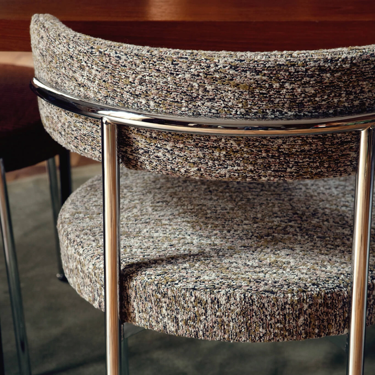 Alliant design contemporain et élégance intemporelle, la chaise Libera séduit par la richesse de ses matières et la finesse de ses détails. Revêtue d’un tweed raffiné aux nuances de marron et de vert, elle dévoile une texture vibrante et un jeu de couleurs naturels, conférant chaleur et caractère à l’espace. Son piètement en métal chromé, aux lignes fines et graphiques, apporte une légèreté visuelle et un contraste subtil avec la profondeur du tissu. Cette combinaison de matériaux nobles illustre un design équilibré, où le confort se marie à une esthétique moderne et lumineuse. Idéale autour d’une table de repas, dans un bureau élégant ou un salon contemporain, la chaise Libera incarne un style sobre et raffiné, rehaussé par des finitions impeccables. Elle s’impose comme une pièce essentielle, à la fois fonctionnelle, confortable et résolument design.