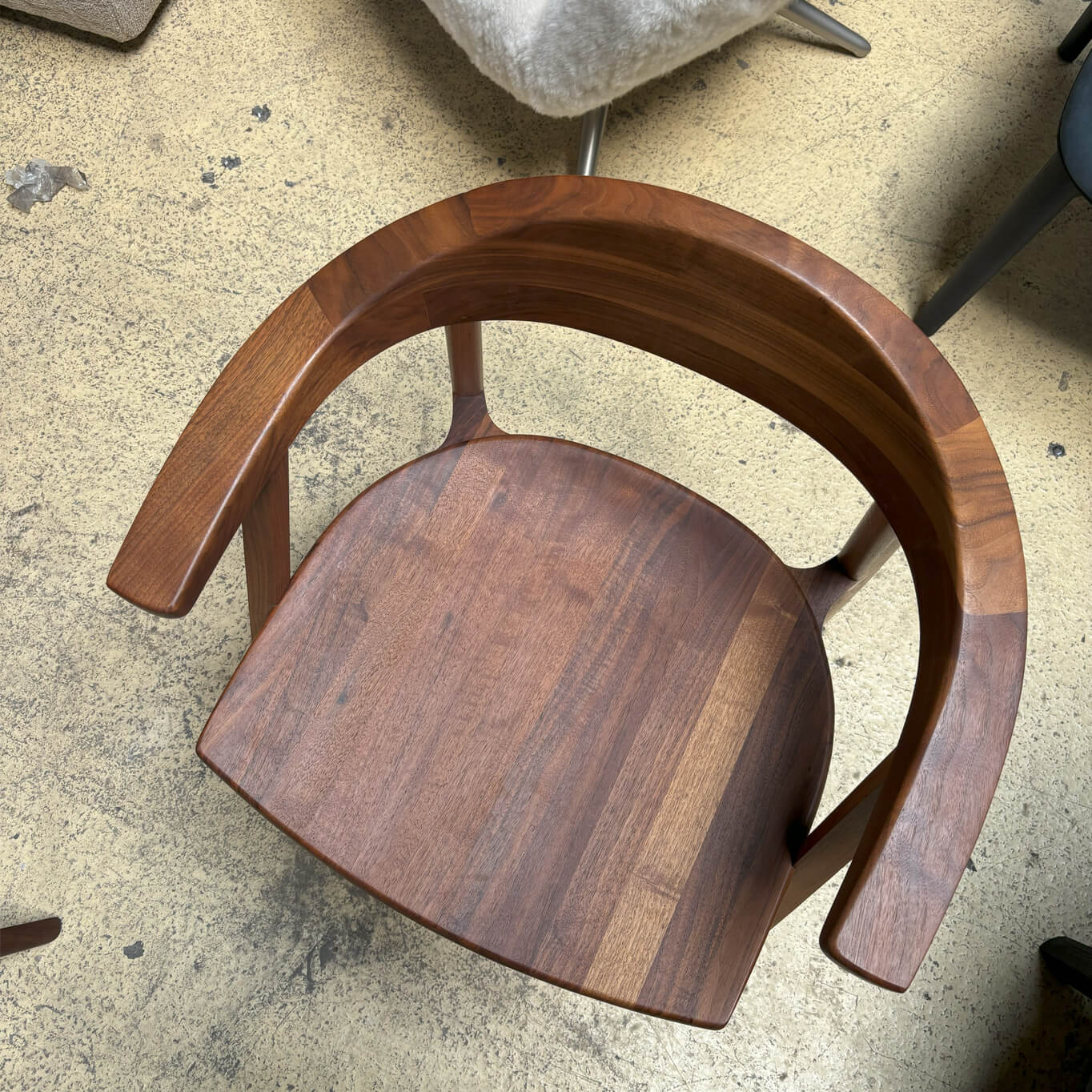 La chaise d'occasion Mantis de BassamFellows est une chaise aux contrastes forts et élégants. Réalisée en bois massif, elle présente à la fois des lignes strictes dans sa structure et des courbes pour l'assise et le dossier, afin d'en optimiser le confort. Visuellement légère mais très robuste, chaque chaise d'occasion Mantis est unique et sublime une table de salle à manger. Mantis est entièrement sculptée en bois massif, et les finitions ne masquent jamais la beauté naturelle du bois, qui se patine très bien avec le temps. Les jointures sont renforcées par des broches d'acier pour garantir force et longévité. Sans coussin, la forme ergonomique permet de rester des heures assis à discuter, travailler ou diner. Inspirée par la mante religieuse, Mantis de BassamFellows est le type de fauteuil qui s'intègre dans les espaces aussi bien privés que publics.