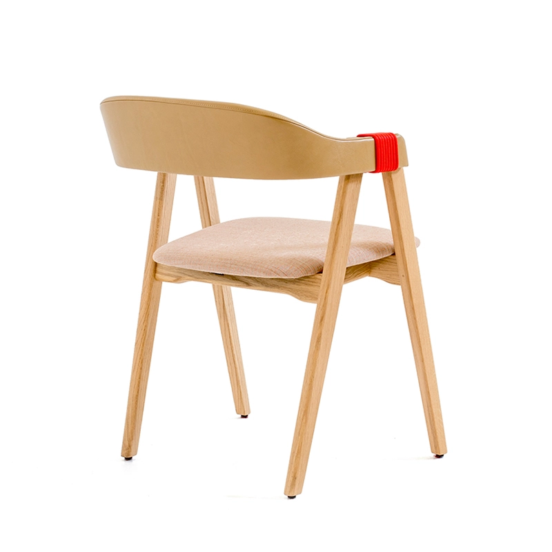 structure chêne huilé naturel, rembourrage mousse polyuréthane, accoudoirs corde synthétique tressée rouge, dossier cuir ciré, asise tissu