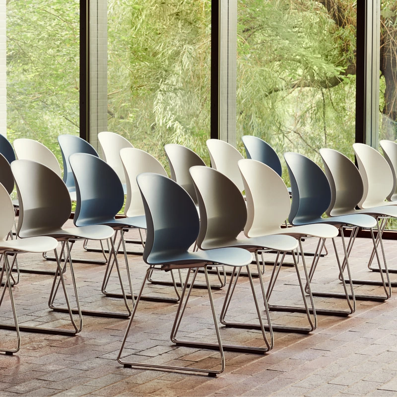 N02 Recyclé est une chaise solide et empilable, conçue par le studio Japonais Nendo, qui a puisé son inspiration dans le pli d'une feuille de papier posé sur le bureau du designer. L’image du papier plié se traduit par un pli dans la coque de la chaise, permettant à la forme de soutenir à la fois le haut et le bas du dos. La coque de la chaise est en plastique circulaire, ce qui signifie qu'elle est faite de plastique recyclé et recyclable par la suite. Le plastique de la chaise N02 Recyclé de Fritz Hansen provient de déchets ménagers, plastiques collectés, traités et recyclés en Europe centrale. Les options de pieds et de coque font de N02 une solution idéale pour une grande variété d'environnements contractuels tels que les salles de réunion, les cantines et les espaces de présentation. Les bords souples rendent cette chaise extrêmement confortable, même lors d'une assise prolongée.