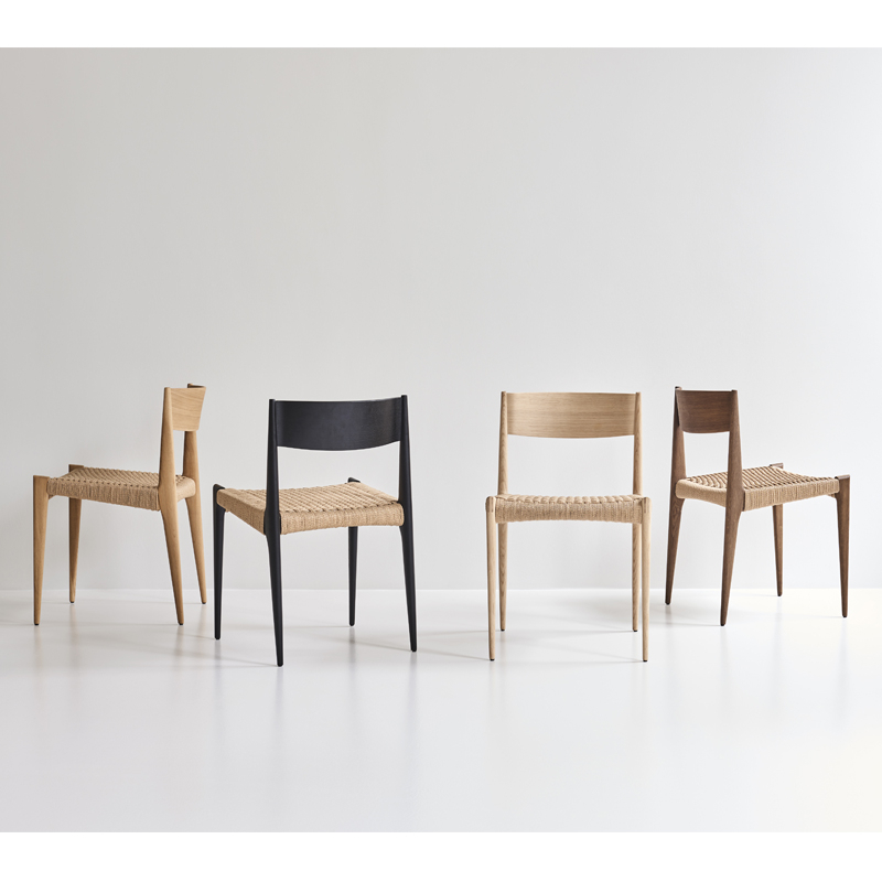 Les pieds fins et coniques en bois massif donnent à la chaise Pia DK3 une expression visuelle légère. L'assise est réalisée en cordelette de papier tressée à la main, et le dossier est moulé, ce qui confère un confort d'assise optimal.