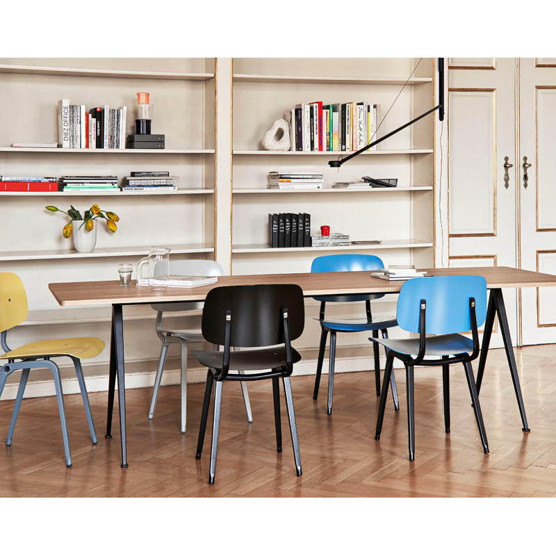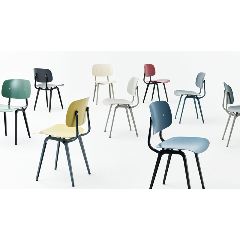 Créée à l'origine par Friso Kramer alors qu'il travaillait chez Ahrend dans les années 1950, la chaise Revolt a été relancée par Hay avec Ahrend. L'une des créations les plus célèbres de Friso Kramer, la chaise Revolt incarne son style minimaliste distinctif ; une conception révolutionnaire et un choix de matériaux qui utilise un cadre en tôle d'acier plié au lieu d'un cadre tubulaire traditionnel. Reproduite aujourd'hui selon le même processus, la chaise conserve la fonctionnalité et la construction résiliente de son précurseur du milieu du siècle, mais dans un choix de matériau durable comprenant un mélange de matériaux recyclés post-consommation et ABS vierge dans différentes options de couleurs. Dynamique et flexible, la chaise ergonomique de Revolt évolue avec son utilisateur, offrant un soutien actif en travaillant, en mangeant ou en étant assis dans des conférences. Son confort, sa durabilité et son esthétique intemporelle la rendent appropriée pour une utilisation dans une grande variété d'espaces privés, professionnels ou publics.