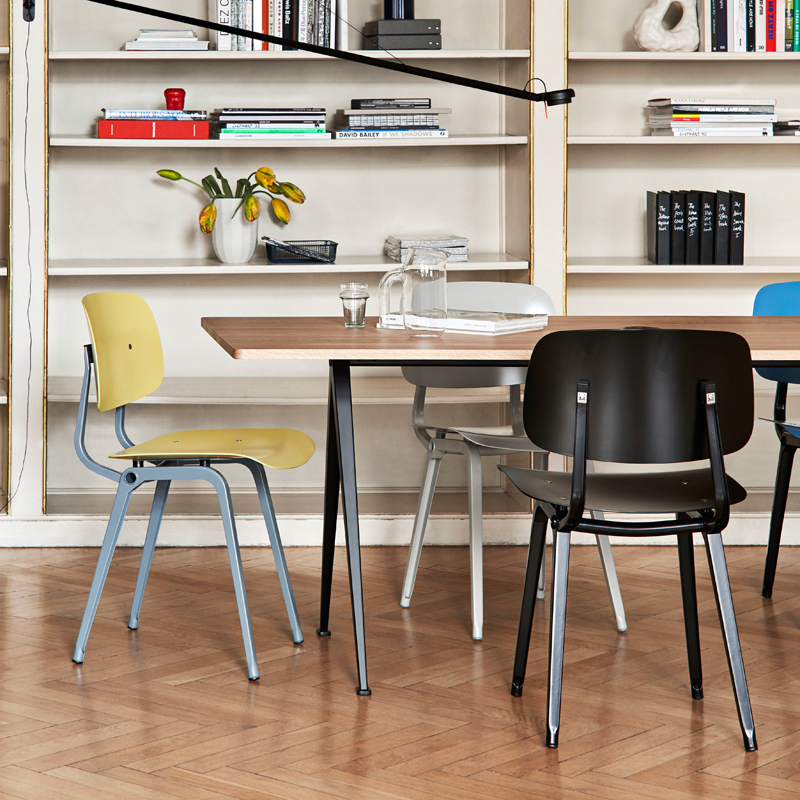 Revolt incarne son style minimaliste distinctif ; une conception révolutionnaire et un choix de matériaux qui utilise un cadre en tôle d'acier plié au lieu d'un cadre tubulaire traditionnel. Reproduite aujourd'hui selon le même processus, la chaise conserve la fonctionnalité et la construction résiliente de son précurseur du milieu du siècle, mais dans un choix de matériau durable comprenant un mélange de matériaux recyclés post-consommation et ABS vierge dans différentes options de couleurs. Dynamique et flexible, la chaise ergonomique de