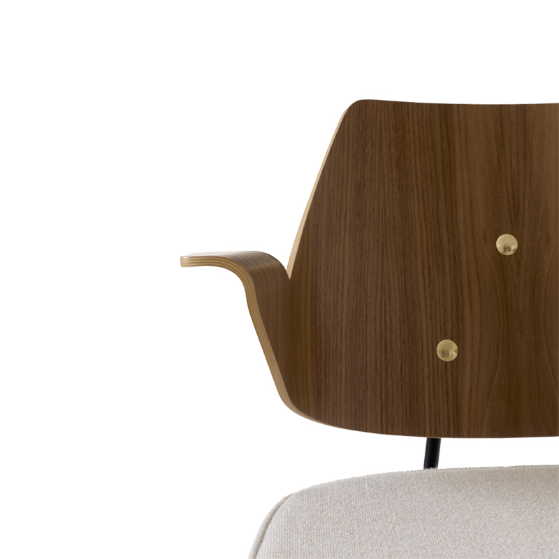 structure en bois de noyer laqué, piètement en acier poudré, mousse hr et tissu