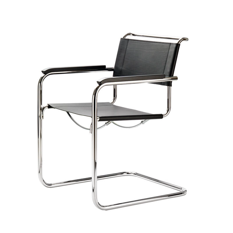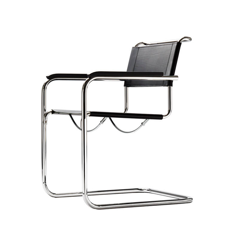 Incontournable du design, la chaise S 34 se distingue par sa forme cubique, son design clair, ses proportions fines et son mouvement de flexion. Cette chaise avec piètement en porte-à-faux, parmi les premières du genre, associe aujourd'hui l'esprit du temps et le sens de la tradition. En 1925, Mart Stam commence ses expérimentations de structure avec des tuyaux de petit diamètre qu’il connecte avec des raccords de tuyauterie utilisés par les plombiers. Il crée ensuite les chaises en porte-à-faux, qui ne reposent plus sur quatre pieds, inventant un nouveau principe de construction. Présentées en 1927, les chaises S 33 et S 34 étaient plus de des simples créations, elles faisaient partie du concept révolutionnaire global d’une nouvelle ère du design. Conçue pour durer, la chaise S 34 Thonet est réalisée en tube d’acier avec une assise et un dossier en cuir.