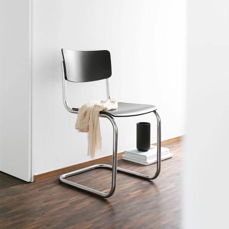 En 1931, Mart Stam révolutionne un concept suivi pendant des siècles en débarrassant les chaises de leurs pieds arrière. Cette idée sera par la suite développée et affinée, donnant naissance à un objet parfait pour les environnements où sobriété et qualité sont de mise. Ce qui compte pour Mart Stam lorsqu’il dessine des meubles, c’est l’utilité et l’aspect économique du meuble, que ce soit sur le plan esthétique ou de la réduction des matériaux. Le résultat est une chaise à la forme rectiligne, dotée d’une construction épurée et d’un confort d’assise amélioré. Son modèle le plus minimaliste est la chaise à piètement luge S 43, pour laquelle il combine une structure en acier tubulaire à un dossier et une assise en bois moulé. La clarté et la sobriété de ce siège à piètement luge reflètent parfaitement l’esprit de modernité de l’époque. Le droit de propriété artistique pour cette chaise de style rigoureusement cubique sans pieds arrière est aujourd’hui détenu par Thonet. Durable est intemporelle, la chaise S 43 trouve sa place dans de nombreux environnements, privés ou publics.