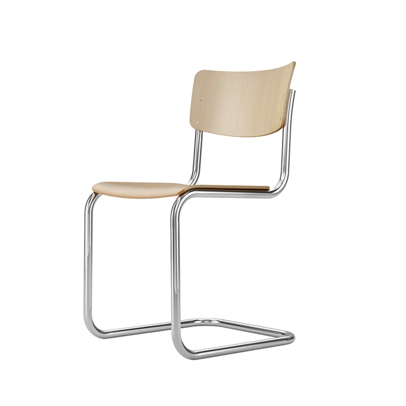 En 1931, Mart Stam révolutionne un concept suivi pendant des siècles en débarrassant les chaises de leurs pieds arrière. Cette idée sera par la suite développée et affinée, donnant naissance à un objet parfait pour les environnements où sobriété et qualité sont de mise. Ce qui compte pour Mart Stam lorsqu’il dessine des meubles, c’est l’utilité et l’aspect économique du meuble, que ce soit sur le plan esthétique ou de la réduction des matériaux. Le résultat est une chaise à la forme rectiligne, dotée d’une construction épurée et d’un confort d’assise amélioré. Son modèle le plus minimaliste est la chaise à piètement luge S 43, pour laquelle il combine une structure en acier tubulaire à un dossier et une assise en bois moulé. La clarté et la sobriété de ce siège à piètement luge reflètent parfaitement l’esprit de modernité de l’époque. Le droit de propriété artistique pour cette chaise de style rigoureusement cubique sans pieds arrière est aujourd’hui détenu par Thonet. Durable est intemporelle, la chaise S 43 trouve sa place dans de nombreux environnements, privés ou publics.