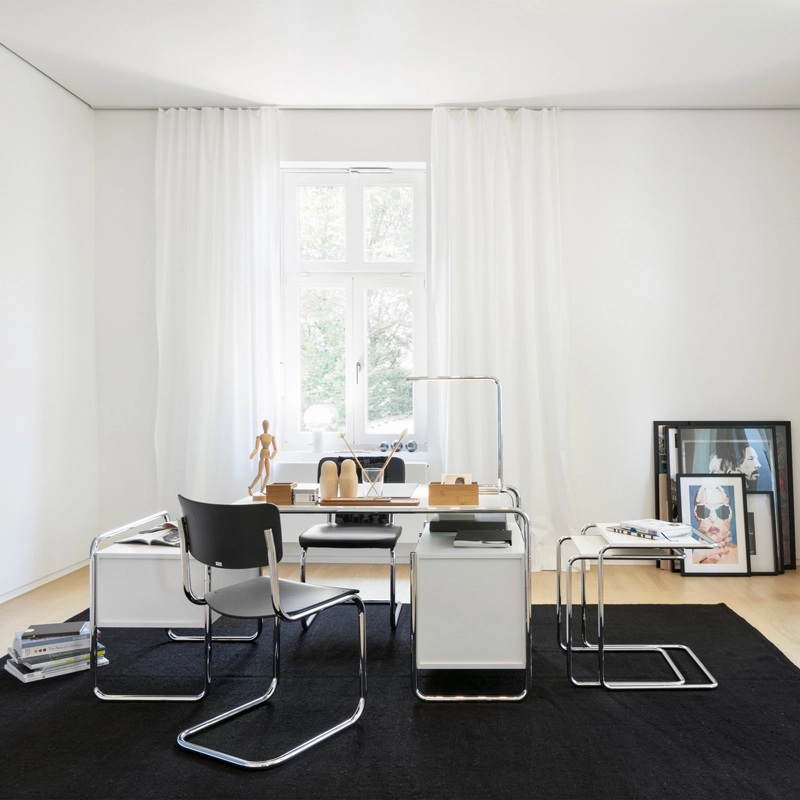 En 1931, Mart Stam révolutionne un concept suivi pendant des siècles en débarrassant les chaises de leurs pieds arrière. Cette idée sera par la suite développée et affinée, donnant naissance à un objet parfait pour les environnements où sobriété et qualité sont de mise. Ce qui compte pour Mart Stam lorsqu’il dessine des meubles, c’est l’utilité et l’aspect économique du meuble, que ce soit sur le plan esthétique ou de la réduction des matériaux. Le résultat est une chaise à la forme rectiligne, dotée d’une construction épurée et d’un confort d’assise amélioré. Son modèle le plus minimaliste est la chaise à piètement luge S 43, pour laquelle il combine une structure en acier tubulaire à un dossier et une assise en bois moulé. La clarté et la sobriété de ce siège à piètement luge reflètent parfaitement l’esprit de modernité de l’époque. Le droit de propriété artistique pour cette chaise de style rigoureusement cubique sans pieds arrière est aujourd’hui détenu par Thonet. Durable est intemporelle, la chaise S 43 trouve sa place dans de nombreux environnements, privés ou publics.