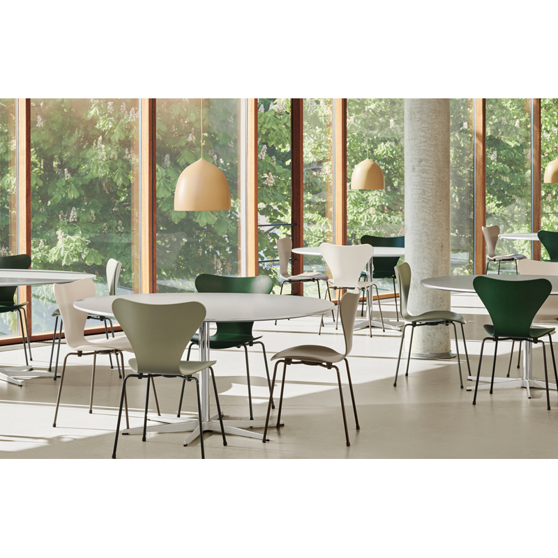 Les chaises Série 7, dessinées par Arne Jacobsen en 1955, sont de loin les chaises les plus vendues de l'histoire du fabricant Fritz Hansen. Classiques du design, elles font partie de notre quotidien.  Visionnaire, Arne Jacobsen a exploité les possibilités du placage et moulage du bois déjà employé sur la chaise Fourmi en 1952, pour parvenir à la forme iconique de la Série 7. Légère et empilable, elle s'impose dans tous les espaces par sa forme douce et son confort. Sa structure chromée s'associe avec un siège en noyer, chêne, chêne foncé, ou frêne coloré. La Série 7 se décline également en version enfant.