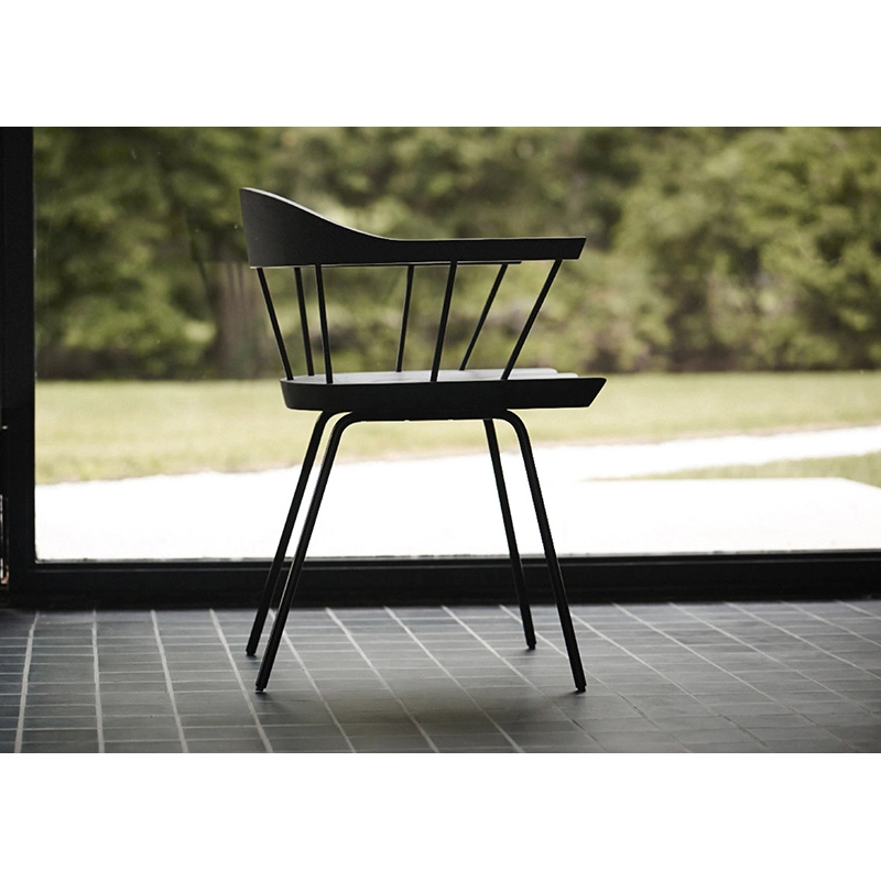 Le petit fauteuil Spindle créé par Craig Bassam pour Bassam Fellows s’inspire de la chaise anglaise Windsor créée au XVIIIe siècle. Cette collection de sièges incarne parfaitement le contraste entre l’ancien et le nouveau. Le petit fauteuil Spindle possède une silhouette fine avec des pieds et des tiges en métal aussi minces que possible. Les différents éléments ergonomiques sont en bois sculpté, donnant l’impression qu’ils sont en apesanteur, grâce à leurs supports fins. Chaque petit fauteuil Spindle est conçu avec un système pivotant avec retour pour une facilité d'utilisation et une apparence soignée, ce qui en fait également une solution très pratique pour les environnements d'accueil.