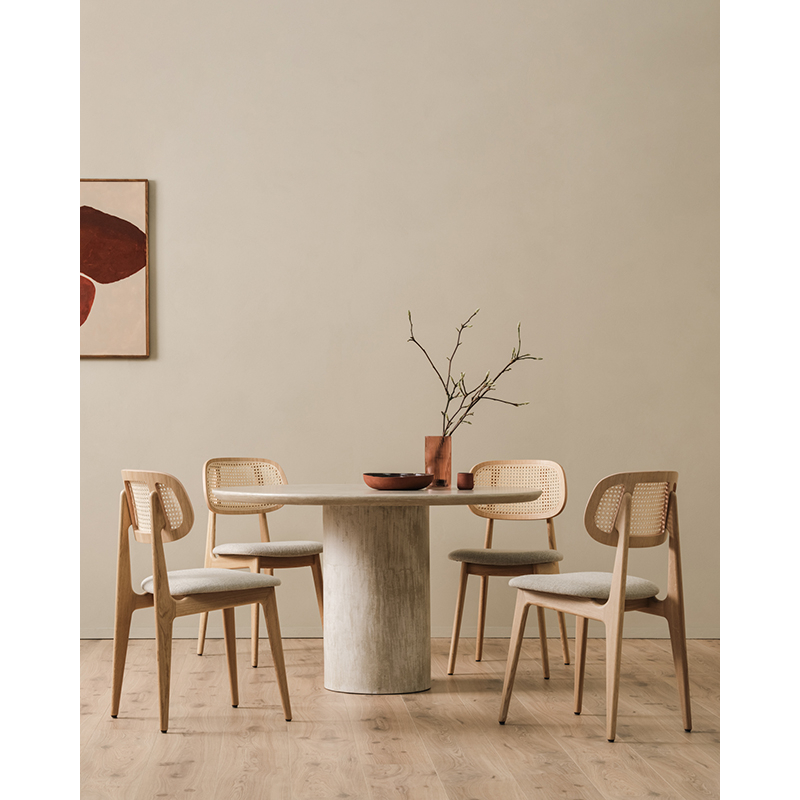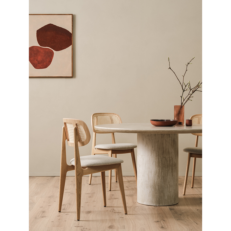 chêne massif et feutre, dossier rotin, assise rembourrée tissu lime white bouclé