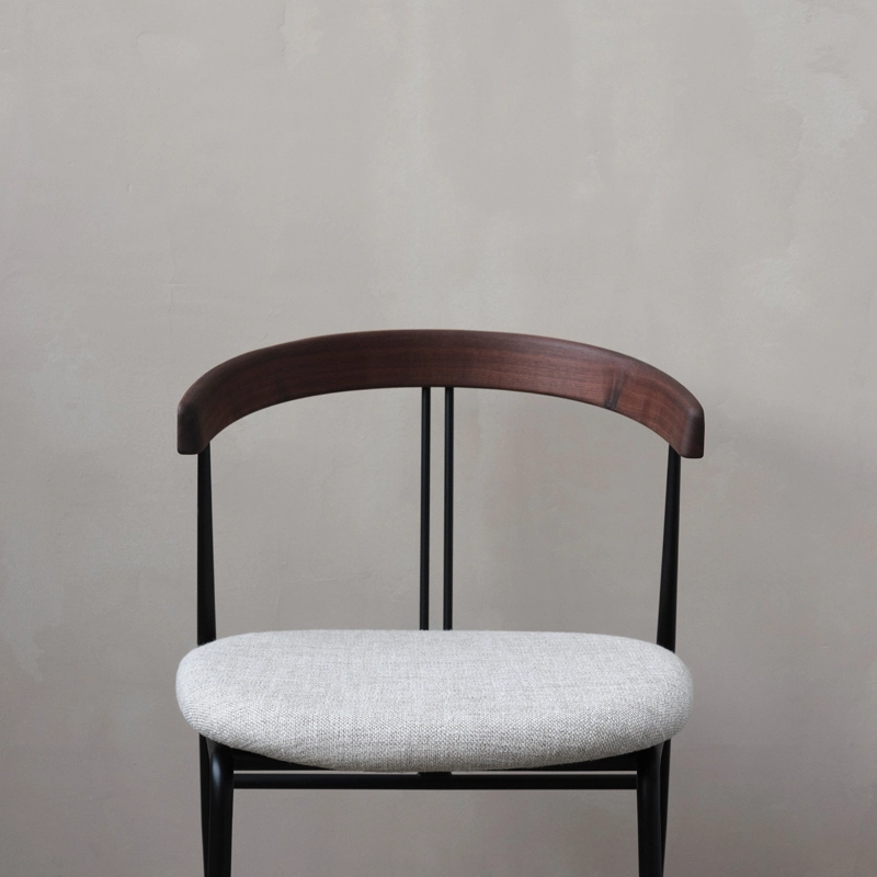 dossier noyer, assise tissu dedar ou gabriel, acier finition époxy noir