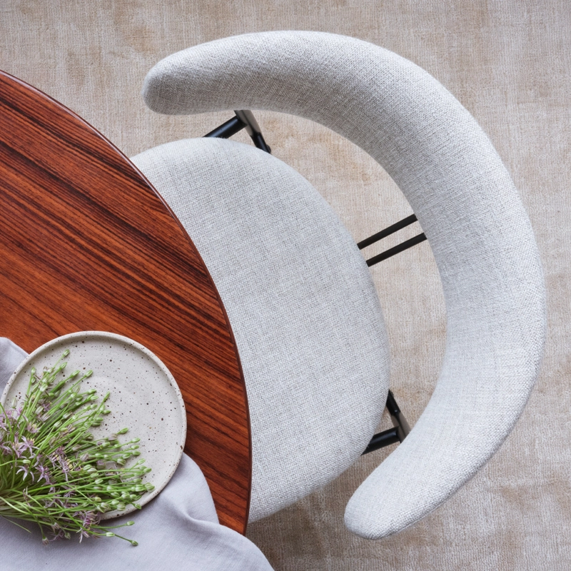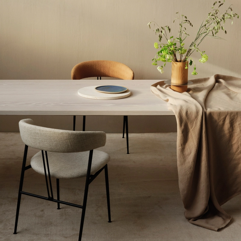 Dessinée par le duo GamFratesi pour la marque Gubi, Violin est une collection de chaises élégantes, légères et contemporaines, qui illustre parfaitement le savoir-faire, la créativité et la compréhension des matériaux du duo de designers. Le nom fait référence aux deux lignes parallèles qui s’étendent du dossier jusqu’à une barre horizontale sous le siège, évoquant les cordes d’un violon, ou même un diapason. La musicalité du nom résonne avec une chaise qui évoque un instrument de musique dans sa géométrie, sa symétrie et son savoir-faire. D’autres détails tels que les lignes douces de chaque côté de ces barres parallèles imprègnent la chaise d’une expression distinctive. Les détails raffinés donnent à la chaise Violin sa signature esthétique ainsi qu’un support fonctionnel pour le dossier. La structure effilée supporte un siège généreux tout en rondeur et un dossier enveloppant qui s’étend pour soutenir les bras, les coudes ou les mains. La forme du dossier permet des mouvements faciles tout en étant très confortable, même après un long diner. Disponible avec une assise rembourrée associée à un dossier en bois ou dans une version plus volumineuse où l’assise et le dossier sont rembourrés, la chaise Violin est dotée d’une silhouette claire et d’une identité forte, trouvant sa place aussi bien dans les intérieurs contemporains que dans les espaces collectifs. Avec son poids réduit, la chaise Violin est facile à déplacer et sa structure ouverte lui donne un aspect aérien.