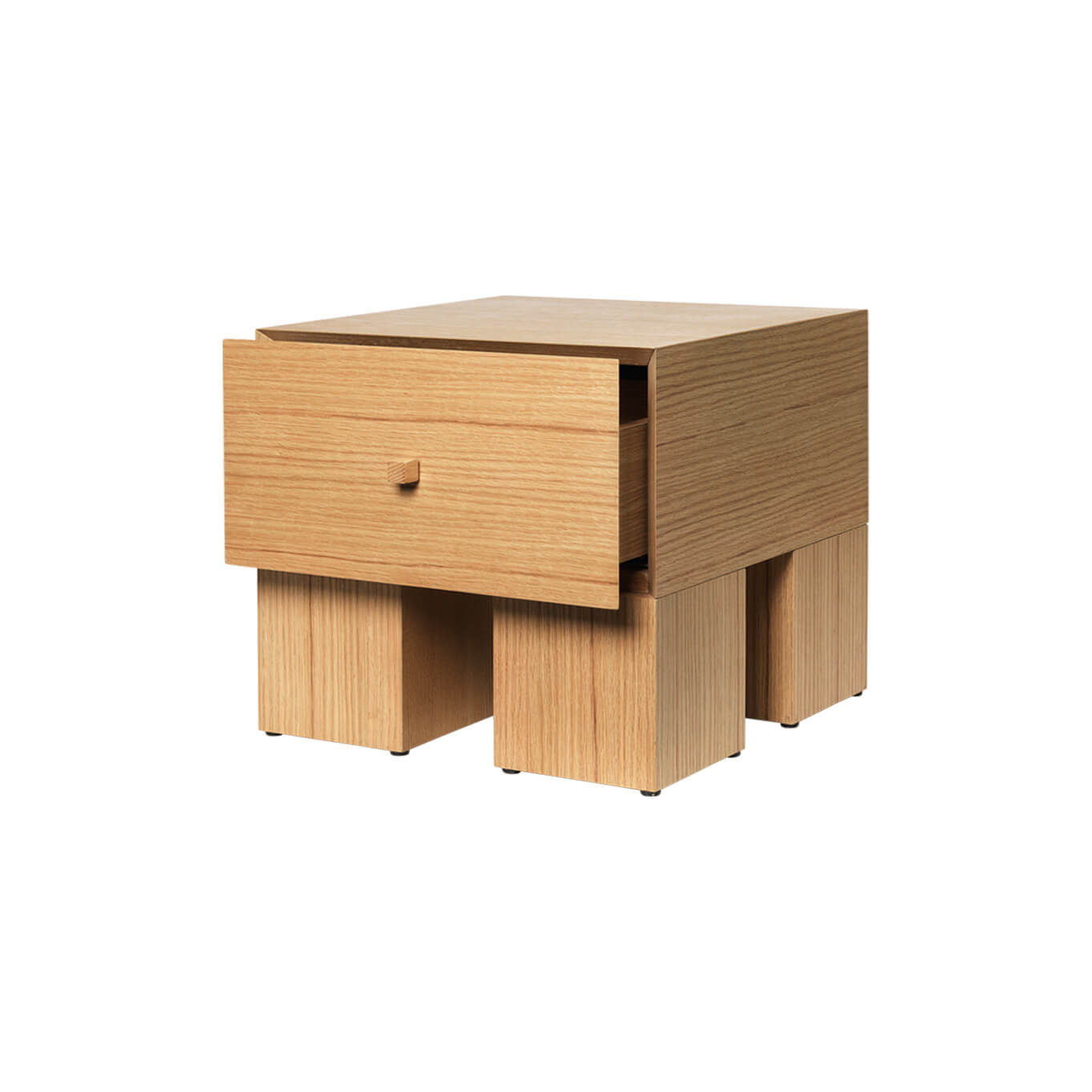 La table de chevet Kuben de Ferm Living est fabriquée en placage chêne naturel certifié FSC. Sa forme cubique anguleuse et son assemblage à l’onglet créent l’illusion d’une boîte sans raccords, tandis que les pieds surdimensionnés en forme de cube créent un caractère audacieux. Les poignées délicates apportent une touche raffinée, renforçant l’intrigue ludique du design. Alliant harmonieusement fonctionnalité et esthétique minimaliste, elle offre un vaste espace de rangement et présente un aspect moderne, idéal pour tous les intérieurs.
